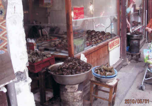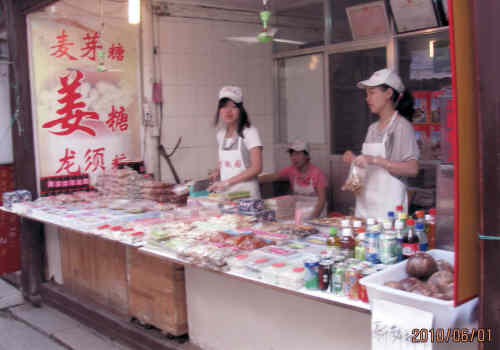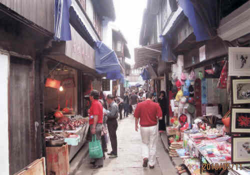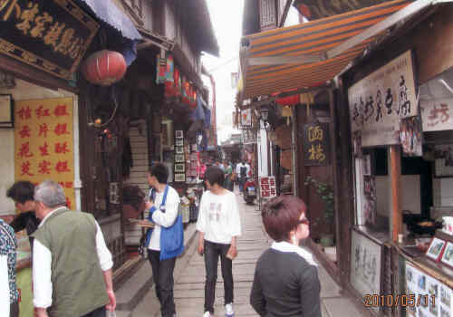 朱家角にある、狭い路地の両側に飲食店、土産物やがひしめく北大街。