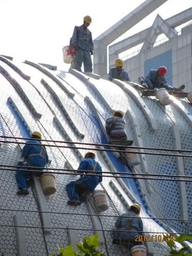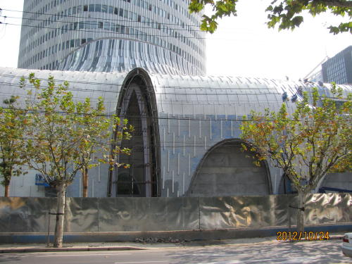 ルイヴィトンビルの工事現場は上海虹橋開発区のビジネス街の一角の元百盛百貨店に隣接する敷地となっていて沢山のビジネスマンたちが行き交う場所。虹橋のシェラトンホテルも近く、年内オープンを目指す島屋百貨店もすぐ近くの古北地区に隣接しています。