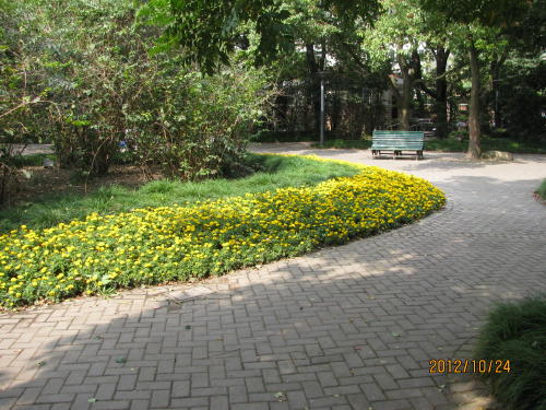 花壇の脇に黄色の花の菊が綺麗に咲いていました。上海で一番秋を感じるのは花木で無く上海蟹でしょう。- 旅行時期
