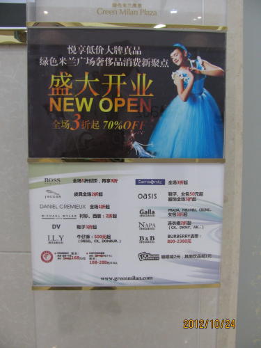 かけました。国権路を行くと金色の建物が見えました。緑色米蘭広場の看板が見えました。早速入って看ると盛大開業、70%OFFの看板に期待して二階へ上がりましたが婦人服の五店舗のみ、ブランドもマイナーで70%OFFも無く期待はずれでした。