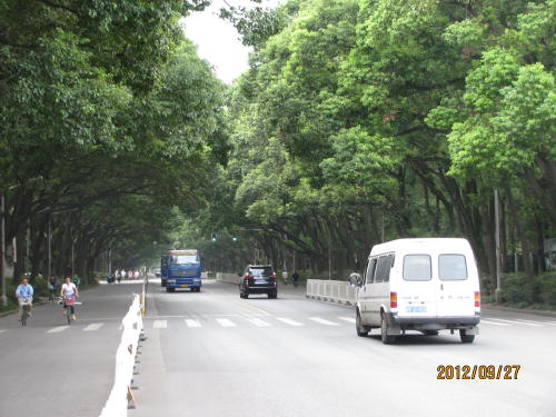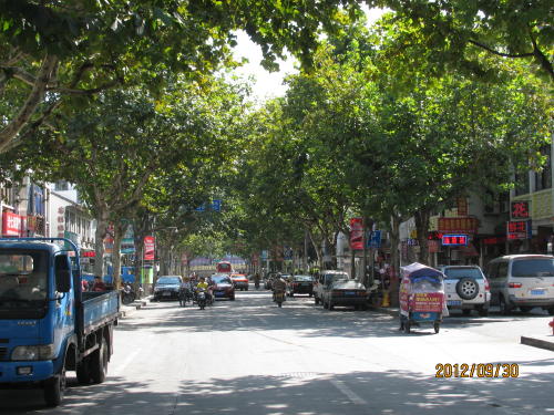 上海市郊外、嘉定区の城内にある清河路の並木路にやってまいりました。現在は地下鉄11号線に乗って30分で嘉定に到着します。終点の一つ手前の嘉定西駅で下車し、バスに乗って外掘りで降ります。ここから清河路を中心部に向かって秋霞園まで歩いて行きます。清河路は道幅も広く、歩道に緑地帯も設けてあり、綺麗な路でした。