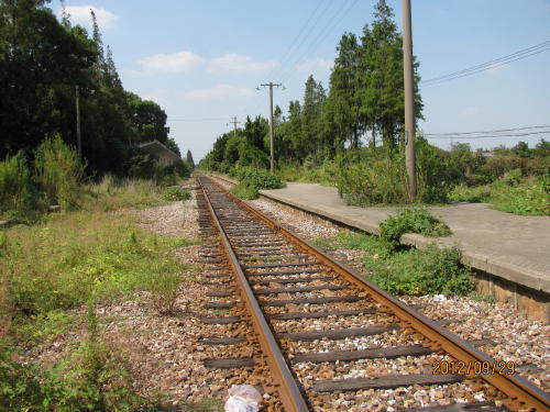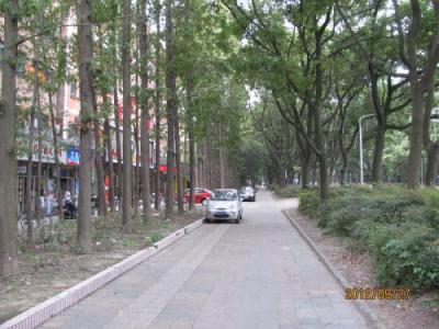 金山区には蓮花路からバスで行くが、今回は前日開通した金山鉄道で行きました。金山鉄道の終点、金山衙駅からバスで石化汽車駅へ、隆平路はこの石化汽車駅から東に伸びる路です。トンネル状になった並木路、歩道の並木も美しい、右は住宅地、左は緑地帯と線路。店は1軒もなく静かな並木道でした。- 旅行時期