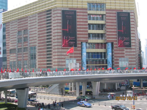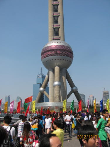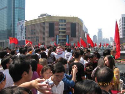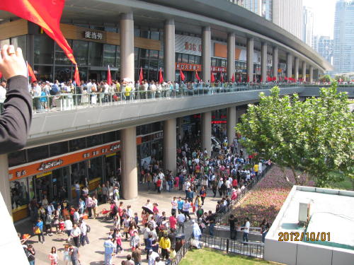 旧正月の春節と五月の国際労働節と並ぶ法廷祝日連休です。国慶節とは中華人民共和国の建国記念日。1949年10月1日に故・毛沢東主席が天安門で建国宣言をした日で7日間のお休みとなる。休暇を利用して故郷に帰る人、国内、海外旅行に行く人など楽しみにしている人が多い。日本に旅行を計画していた人も多くいましたが香港、韓国、ハワイなど他の国に変更したようです。日本人も他の国に変えたようです。浦東一の繁華街、陸家嘴の国慶節はどんなものでしょうか?地下鉄陸家嘴駅に降りると初詣状態。駅を出るだけでも大変です。正大広場前の歩道橋が壊れるのではと思うほどの人・人・人です。ここは歩道橋を通らないと正大広場へもテレビ塔へも行けません。また歩道橋の上から見る景色が素晴らしいので写真を撮る人、物売りがいて人の流れも悪い。正大広場の日本食の店も混んでいます。あまり影響は無いようです。ただ日本人観光客は見えませんでした。- 旅行時期