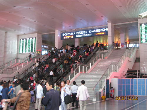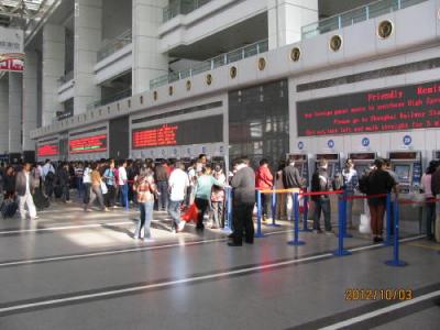 国慶節連休の中日の10月3日に上海駅に行きました。朝地下鉄3号線で上海駅へ向かいましたが通勤客が居ないのでガラ空きでした。中日ですので帰省客、旅行客は少なく、何時もはキップを買う長い行列が嘘のように空いています。蘇州など近郊の旅行は問題なく行く事が出来ます。- 旅行時期