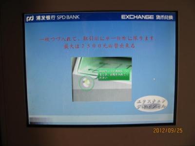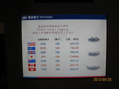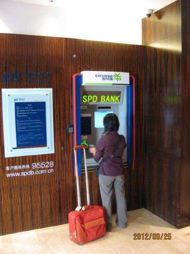南京東路のど真ん中にあるソフィテルホテルの正面入り口を入ると左手にある小さなATM。24時間稼働なので何時でも両替可能、日本語で表示されるので誰でも使える簡単操作。レートも空港より良いのでお得です、場所もホテル内なので安心、銀行の機械ですので安全、申し分ない両替機です。