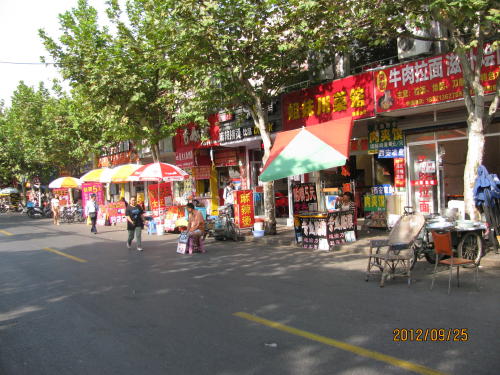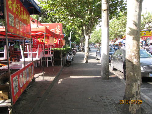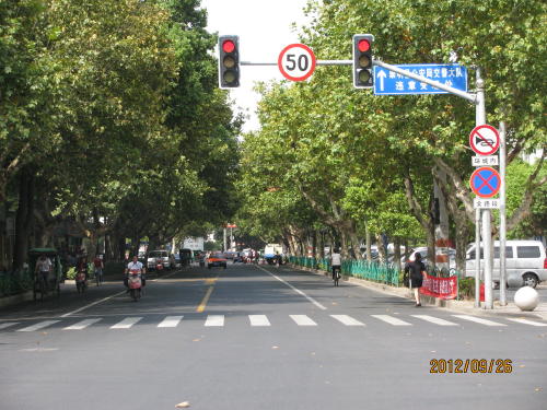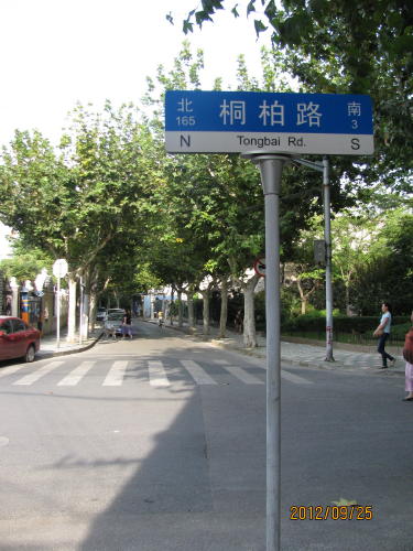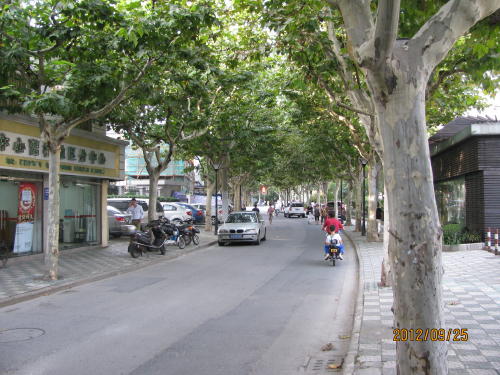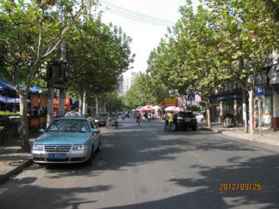 地下鉄3・4号線、中山公園駅下車、凱旋路を地下鉄線に沿って北上、蘇州河を渡ったら蘇州河沿いに西へ大渡河路を進む。長風公園の手前に棗陽路の入り口があります。この間30分程歩きます。入り口から金沙江路までの30分の路は右は華東師範大学、左は長風公園、路には並木も無く、なぜこれが選ばれたのか疑問に思われました。金沙江路から北は選定条件にあった棗陽路になりました。- 旅行時期