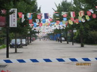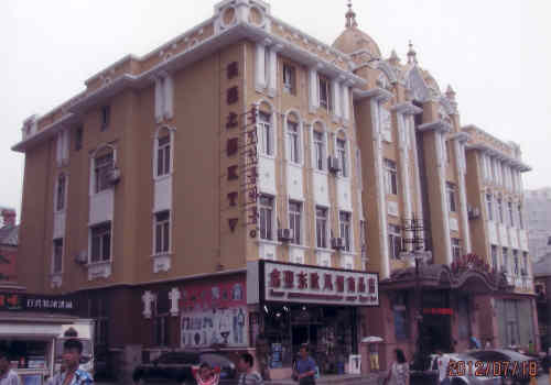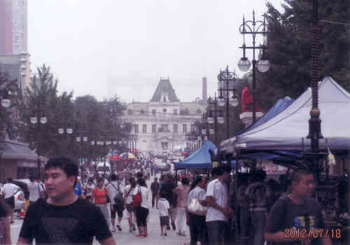 橋を渡った所がロシア街です。正面の建物は芸術展覧館です。現在化粧直し中です。ロシア風情街は帝政ロシアが大連占領時代に造った町で、建物がロシア風です。2000年に新ためて改造され始めてロシア風情街は洋式風格の建築を主として、ロシアレストラン、飲み
