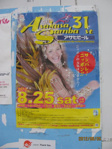 第31回浅草サンバカーニバルが12年8月25日(土)午後1時30分より6時まで開催された。第1回は1981年だそうで結構歴史があったのですね。去年は東日本大震災の影響で中止になった分今年は2年分踊ると皆さん息巻いていました。楽しいリズムや華やかなコスチュームを見る為、早くから場所取りに男が集まっている。写真を撮る男達の熱い眼差し、仕事では見せない真剣な表情でシャッターを押していました。私も同じ・・・場所は東武鉄道浅草駅に近い馬道通りの朝日信用金庫前から雷門通りに入り雷門まえを通り国際通りまで約800メートルのコースです。踊る方も熱いが見る方も暑い。熱中症に罹らないように水分補給を取りましょうと何度もマイク放送をしていました。