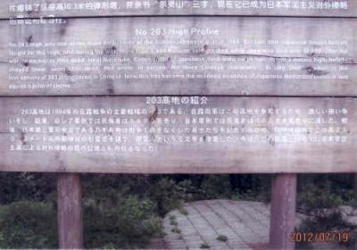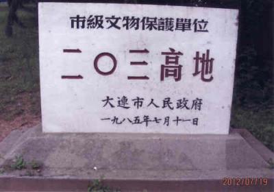 二〇三高地は日露戦争の時に日露両軍が争奪し合っていた旅順西武戦線における主な戦である。旧日本軍が1904年9月19日からロシア軍周陣地を奪い取った後、二〇三高地に向かって総攻撃を行い始め、66日間続いて12月5日にその高地を攻め落とした。当該戦役の中に旧日本軍は一万人以上、ロシア軍は5千人以上死傷した。旧日本軍が二〇三高地を奪い取った後すぐここに重砲観測所を設け、重砲を指揮しながら旅順口を砲撃した。その結果港にあるロシア軍艦は砲撃されほとんど全部沈没した。戦後、旧日本軍国主義の頭である乃木希典は二〇三の(中国語の)音読みによってそれを「爾霊山」と改名した。日本軍の亡霊を供養するために、戦争が残した砲弾の皮と廃棄武器から日本式歩兵銃の銃弾のような形で10.3メートルの高さの「爾霊山」記念タワーを作り上げ、日本の国民を騙している。(原文のまま)- 旅行時期