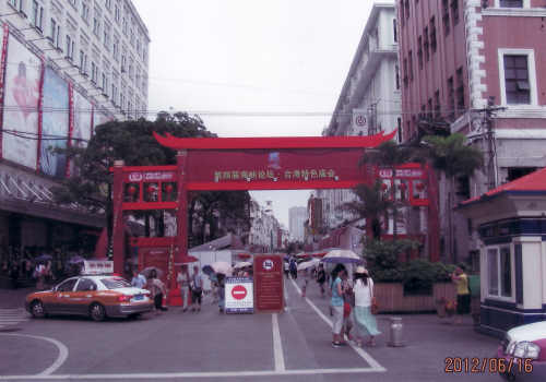 コロンス島のフェリー乗り場の向いから北へ伸びる中山歩行街。租界時代の欧米風の建物が並んでいます。今回は台湾美食フェアーを開催中。昔は福建省と台湾は同一行政区域でしたので先祖はお互いに一緒なのでしょう。台湾の小吃屋台に大勢の人が集まって食べています。