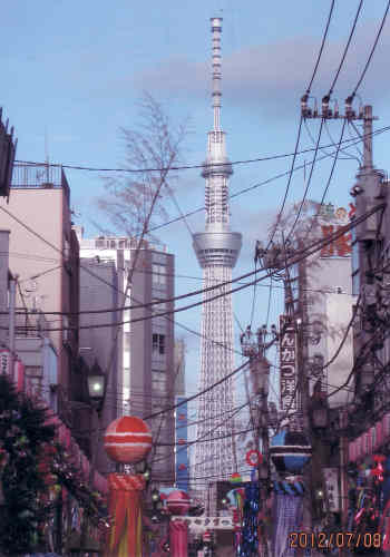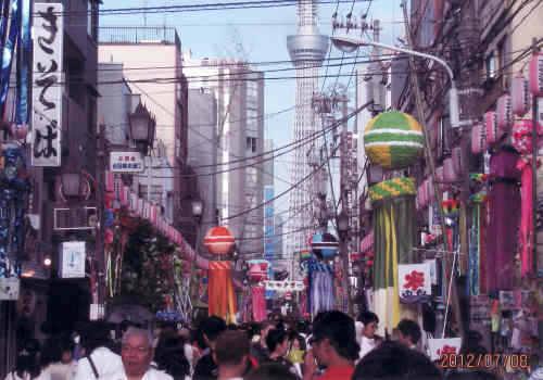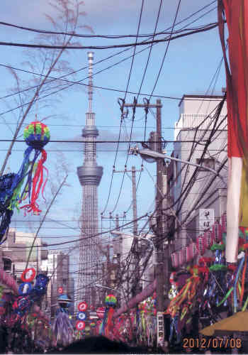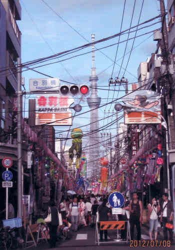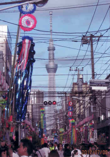 今年のかっぱ橋道具街の七夕祭りはスイツリーオープンに併せ大々的に宣伝しています。スカイツリの見える七夕を見てください。隣の入谷の朝顔市も同じ開催日(6、7、8日)で下町の風物を盛り上げています。屋台も出て美味しい物が食べられて、イベントを見て、もちろんスカイツリーを見て楽しい下町のお祭りです。