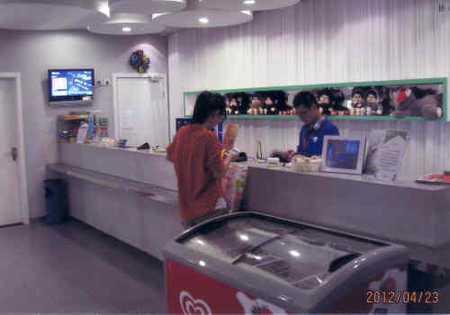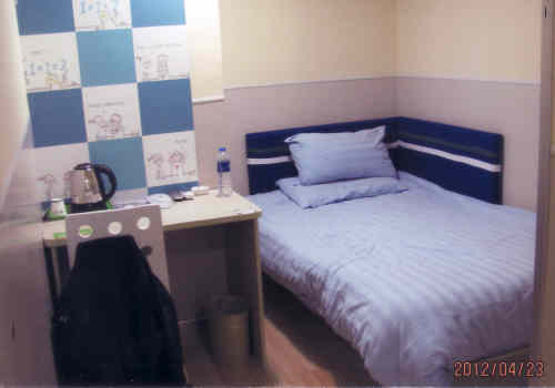 ビジネスホテルチェーン 「漢庭酒店」 は、このホテルは姉妹ブランドの 「漢庭快捷」 とあわせ中国全土で広くチェーン展開するエコノミータイプのビジネスホテル。2008年現在上海市内には、それぞれ人気のエリアに合計34軒のグループホテルが建っています。最近「海友客桟」と呼ぶ更に価格の低い99元から泊れるホテルができました。 宿泊価格から考えると、中の様子がちょっと気になりますが、さっそく入ってみましょう。入り口を入ると、前方奥にすぐフロントがあります。ロビーが無いのでホテル内での待ち合わせにはやや不向き。