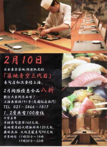 2012年2月10日にオープンした日本の築地、銀座の名店「築地青空三代目」寿司店が上海に上陸いたしました。合点寿司、元禄寿司など回転寿司は多く出店していますが築地の“本格江戸前寿司!!” の名店は上海初。