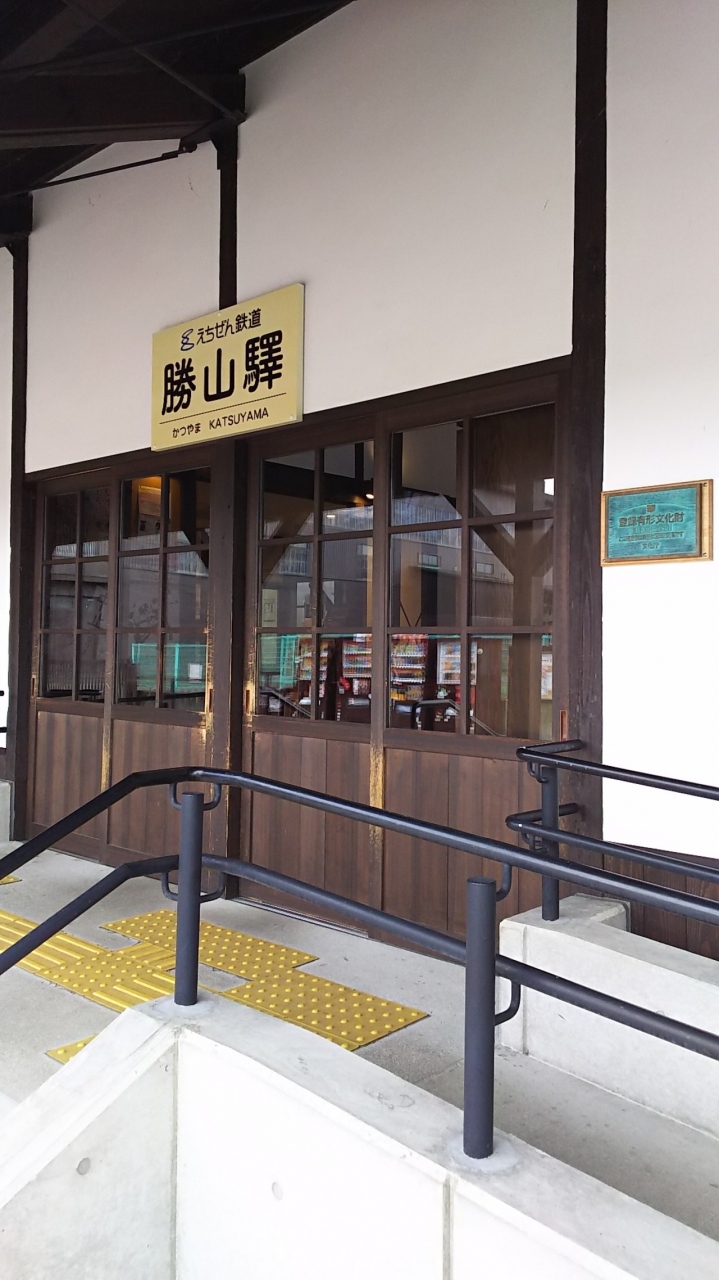 えちぜん鉄道の終着駅、レトロ感に溢れる駅舎です。屋根瓦に木造の駅舎が味わいあっていいですね。登録有形文化財になっています(入口に銘板あり)。待ち時間もゆったりと過ごせます。駅舎の中には喫茶店もあります。