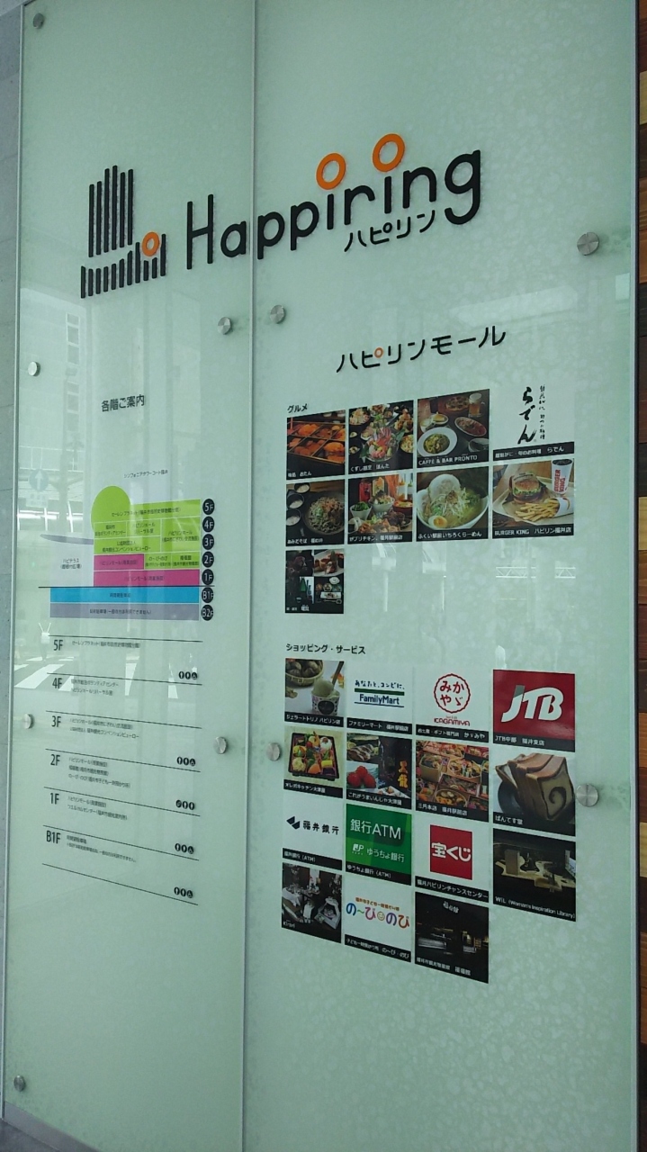 福井駅前に新しくできた「ハピリン」に行ってみました。商業施設などが入る低層階とマンションの高層階に別れています。高さ91mで福井県では最高層のビルです。一般の人が入れるのは低層階のみです。