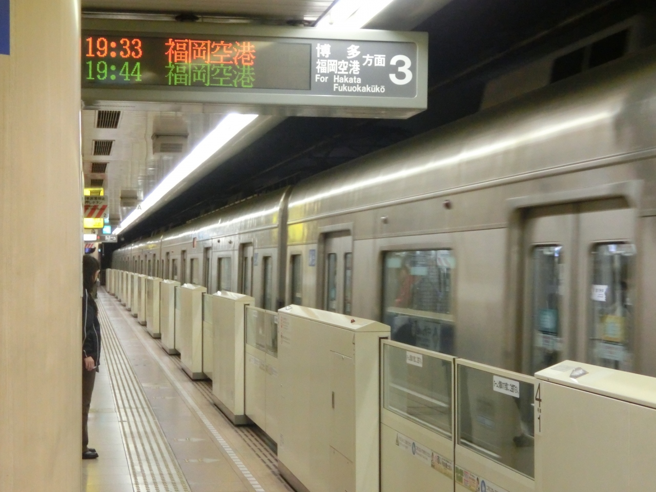 福岡空港から博多駅までは5分、日本一アクセスのよい地下鉄ではないでしょうか。そのためか、比較的混雑しやすいと思います。ワンマン運転のため、すべての駅にホームドアが設置されています。