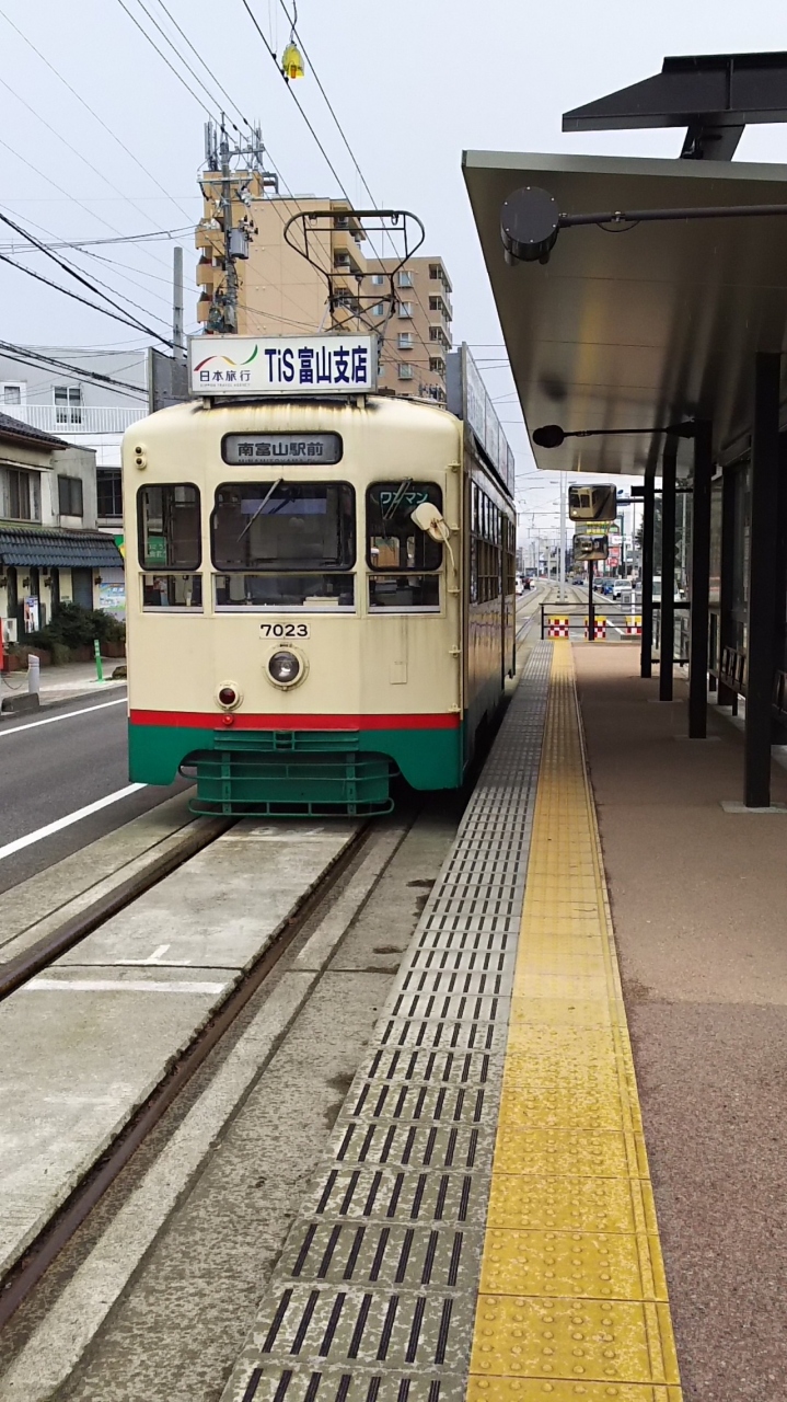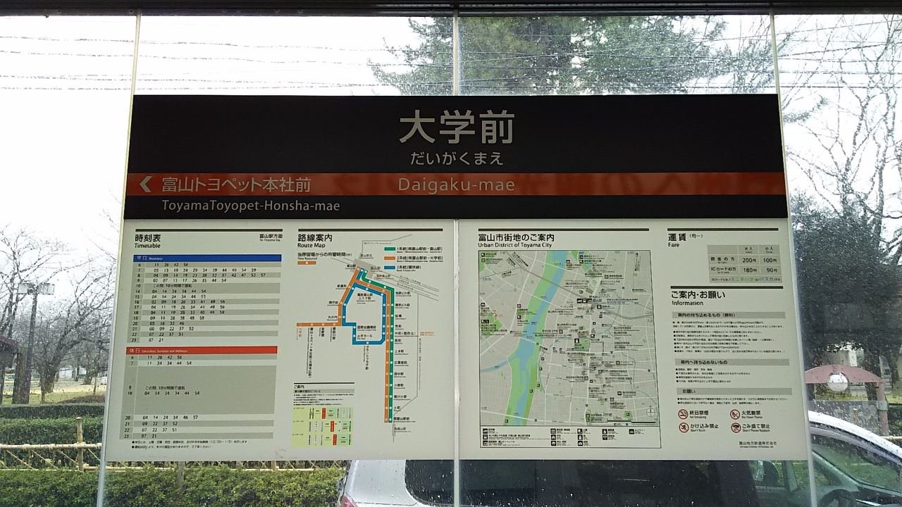 市内電車の終点です。字の如く、富山大学の目の前にあります。ホーム一面だけの停留場ですが、列車は1両しか止められない単線構造になっています。やはり、学生の利用が多いですね。日中は10分間隔で電車が出ているので便利です。