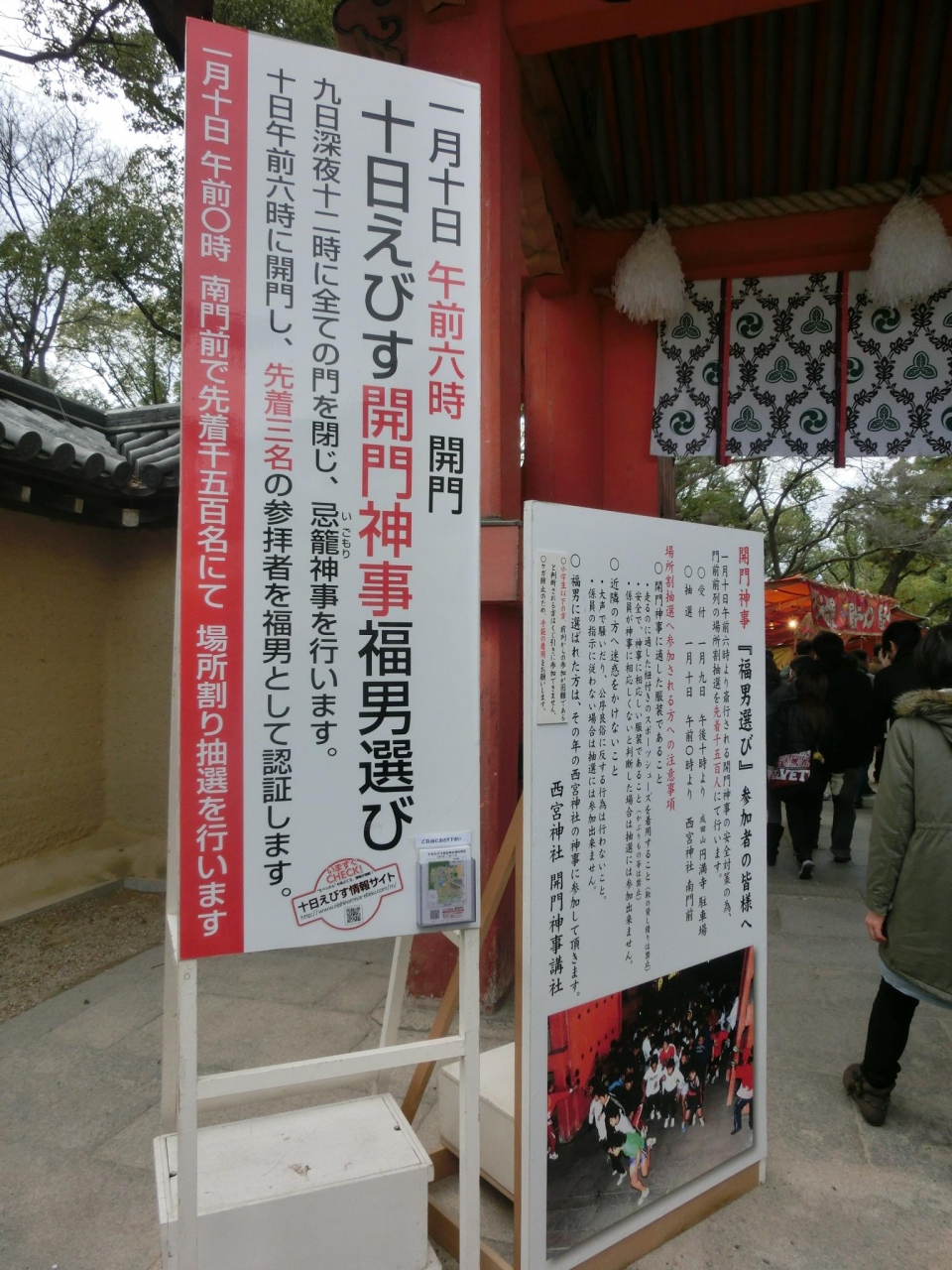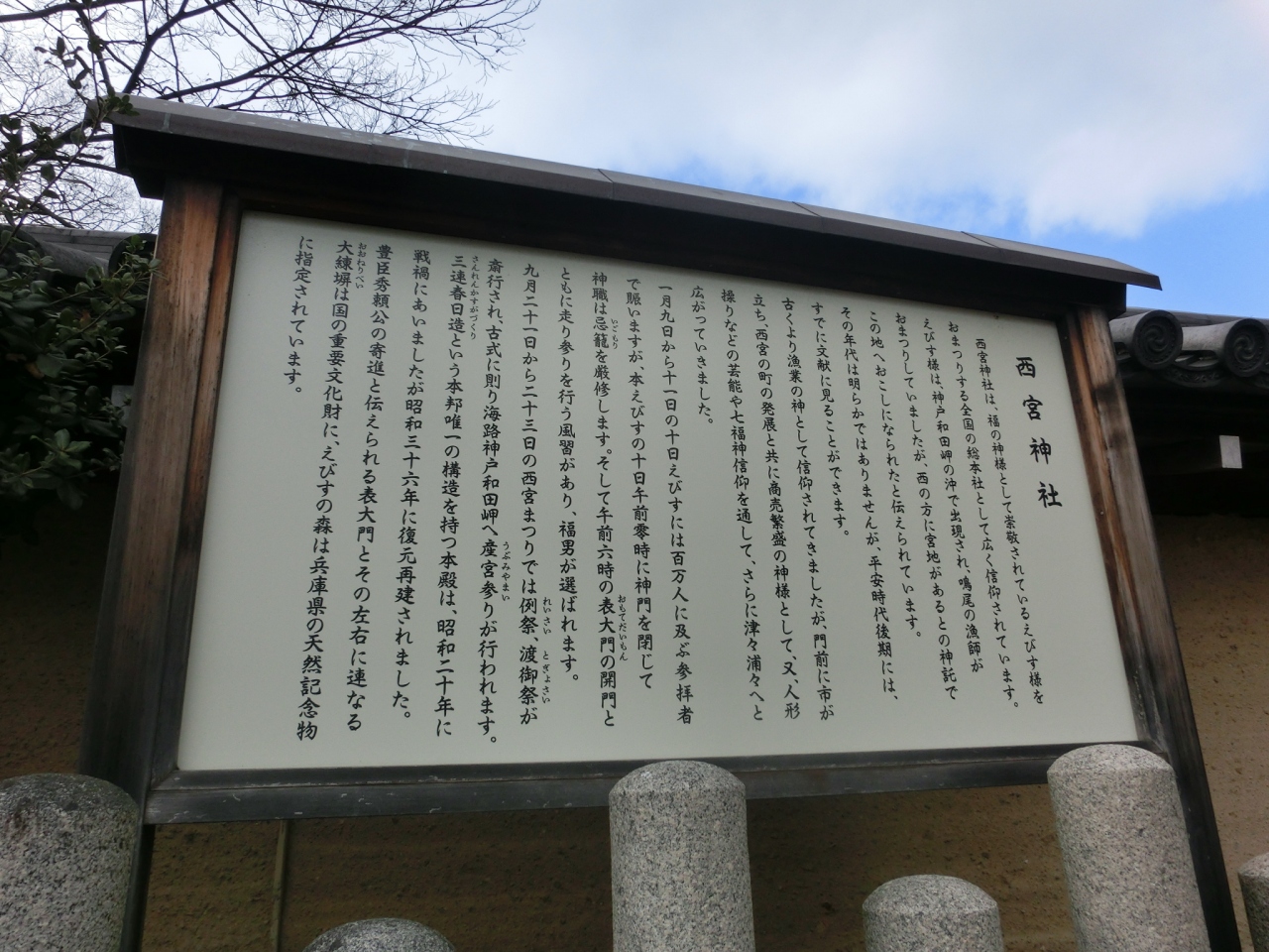 えびす神社の総本山です。全国的には、毎年1月10日の福男選びの競走が行われることで有名です。境内には朱塗りの本殿をはじめ見どころもあります。境内を歩いてみると、ここを全力疾走するのがいかに大変かよくわかります。阪神電車西宮駅から徒歩で行くことができます。