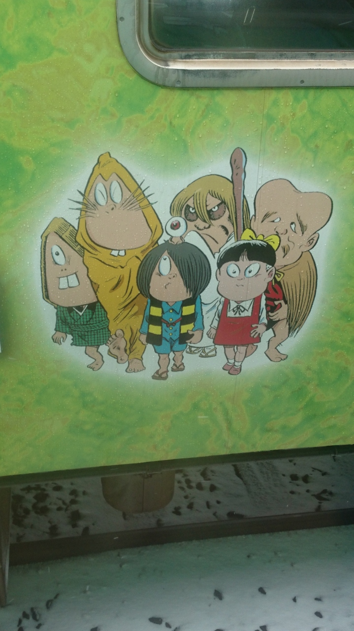 米子空港駅から米子駅まで乗りました。外観だけでなく、車内にまで鬼太郎ワールドに溢れています。