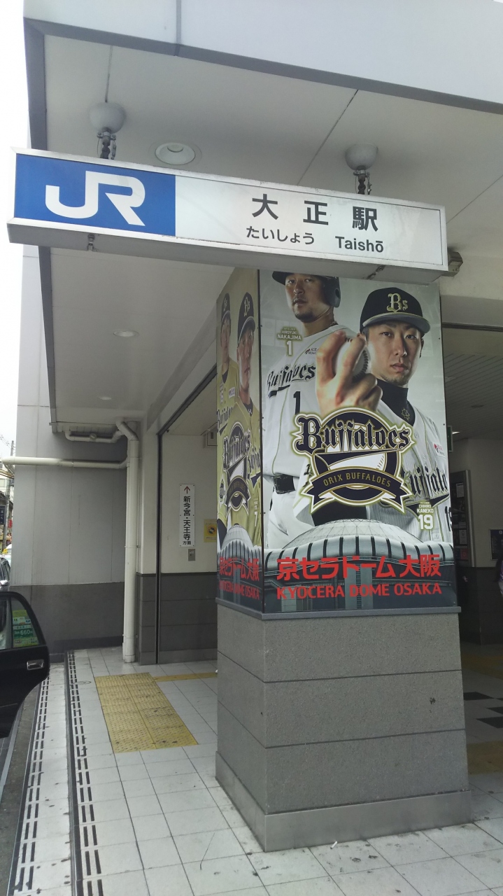 京セラドーム大阪の最寄りで、JR大阪環状線と地下鉄長堀鶴見緑地線の駅となっています。大阪環状線のホームと駅には、バッファローズの選手があちらこちらで見られます。また、新しくなった駅名標には大正区の花の山つつじとシーサーが描かれています。前者は駅のシンボルフラワーとして制定。後者は駅周辺がリトル沖縄だというのが由来です。