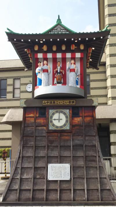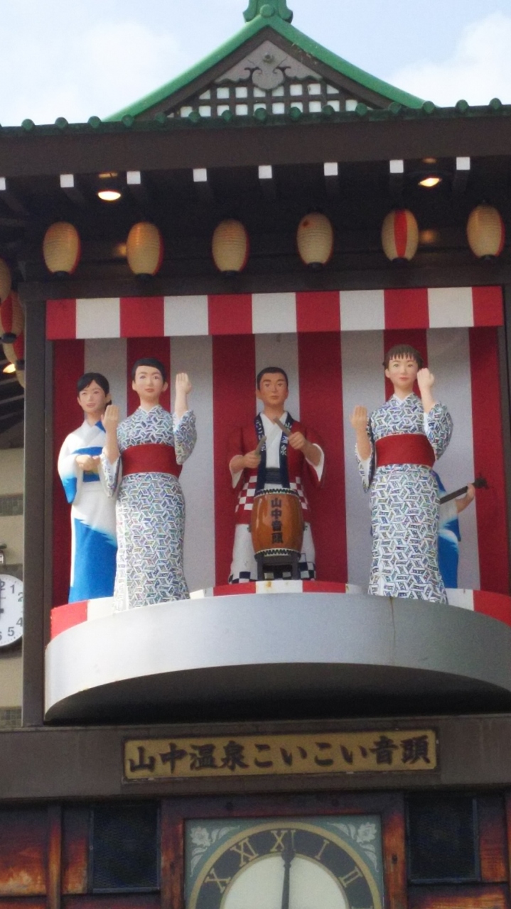 山中座前、山中温泉総湯の菊の湯のそばにあります。旧山中町が加賀市との合併で閉町する記念として設置された時計です。
