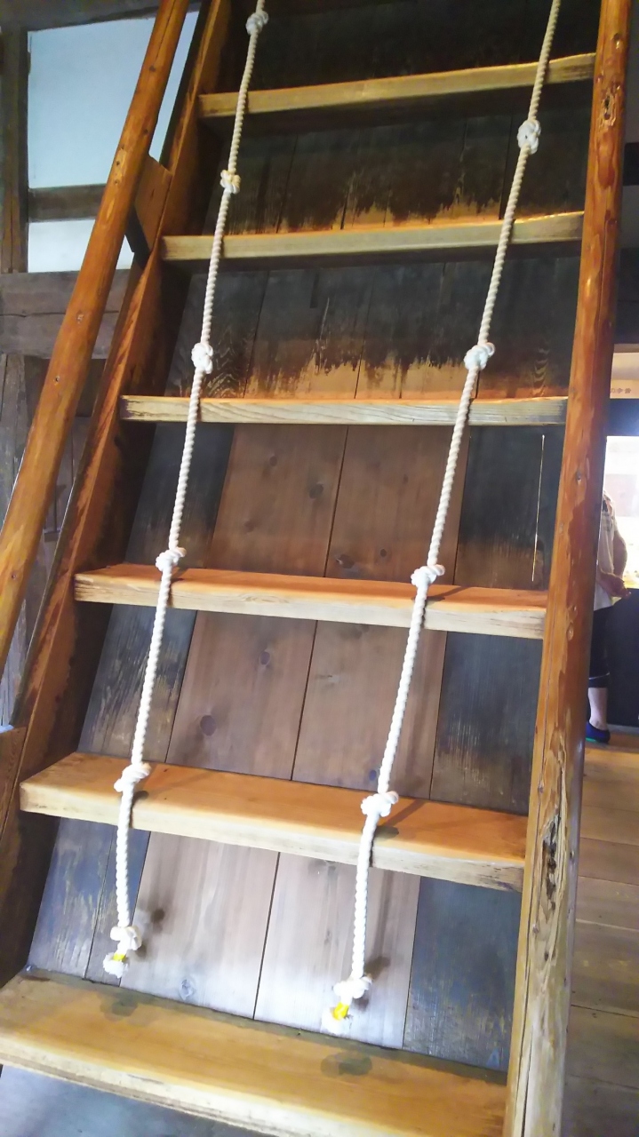 ここの注意点は、まず土足禁止。入口でスリッパに履き替えます。そして、階段が非常に急なところです。階段にあるロープを使わないと登り降りができません。敵から城を守るための構造上、あえて急にしてあるとのことです。