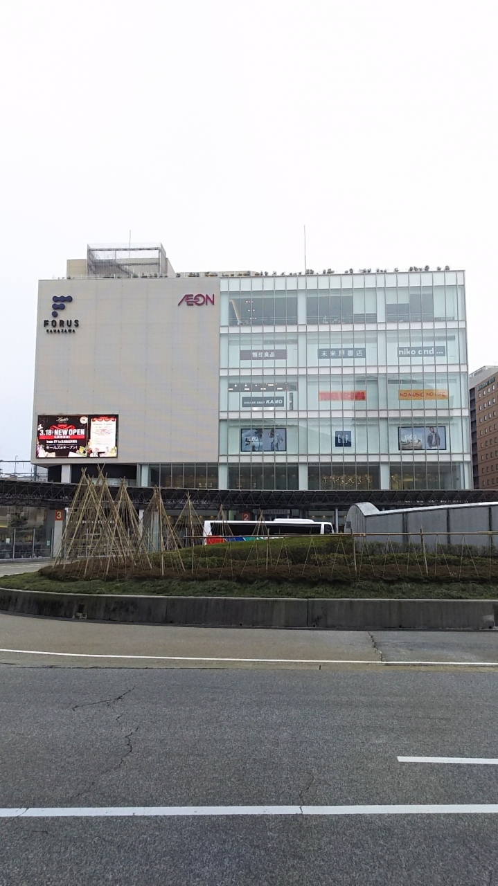金沢駅東口(兼六園口)にあるショッピングモールです。今では金沢駅周辺を代表する顔のひとつになりましたよね。建物にはイオンのロゴがあります。