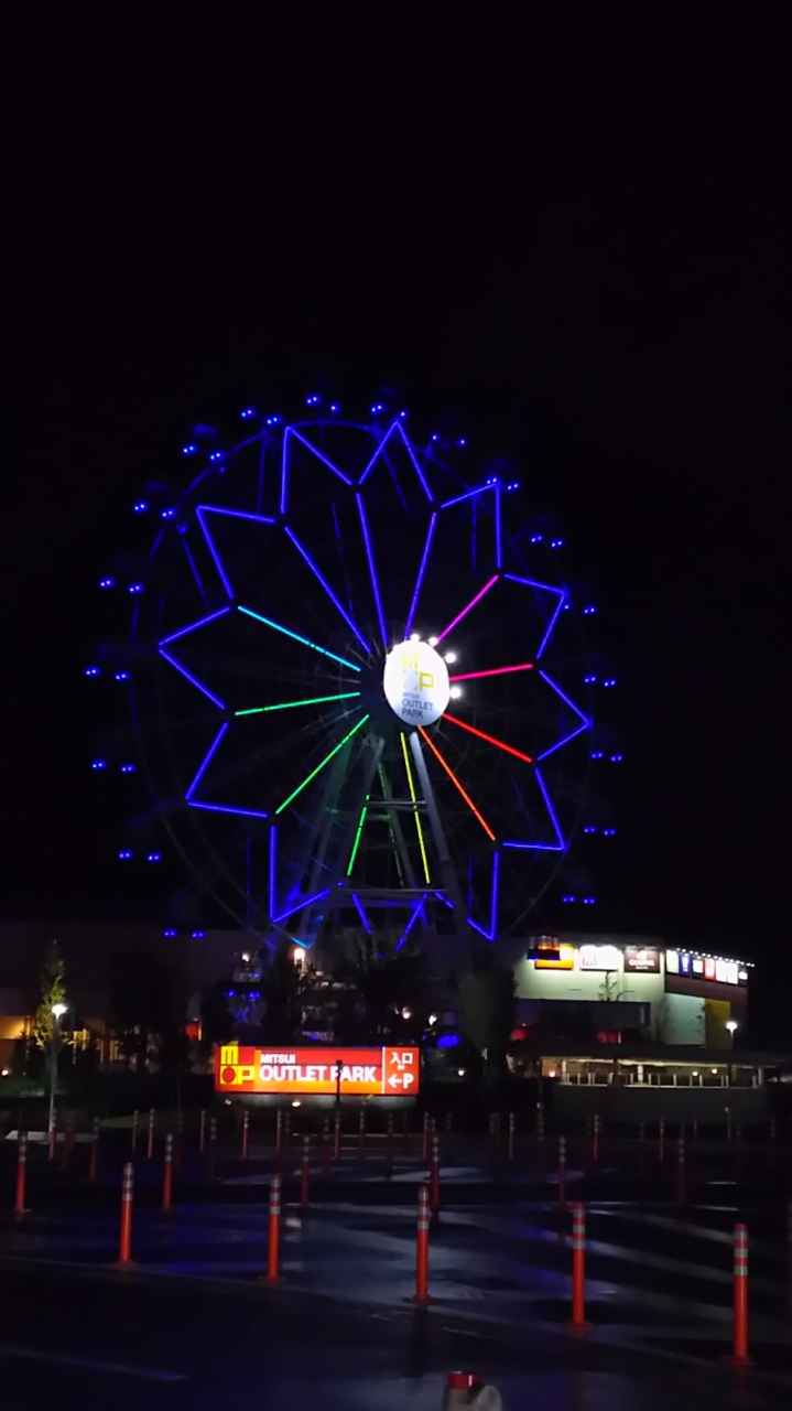 まず目を引くのは観覧車。夜になるとイルミネーションが灯されます。館内はブランドものの店舗が多いですね。フードコートも充実しています。