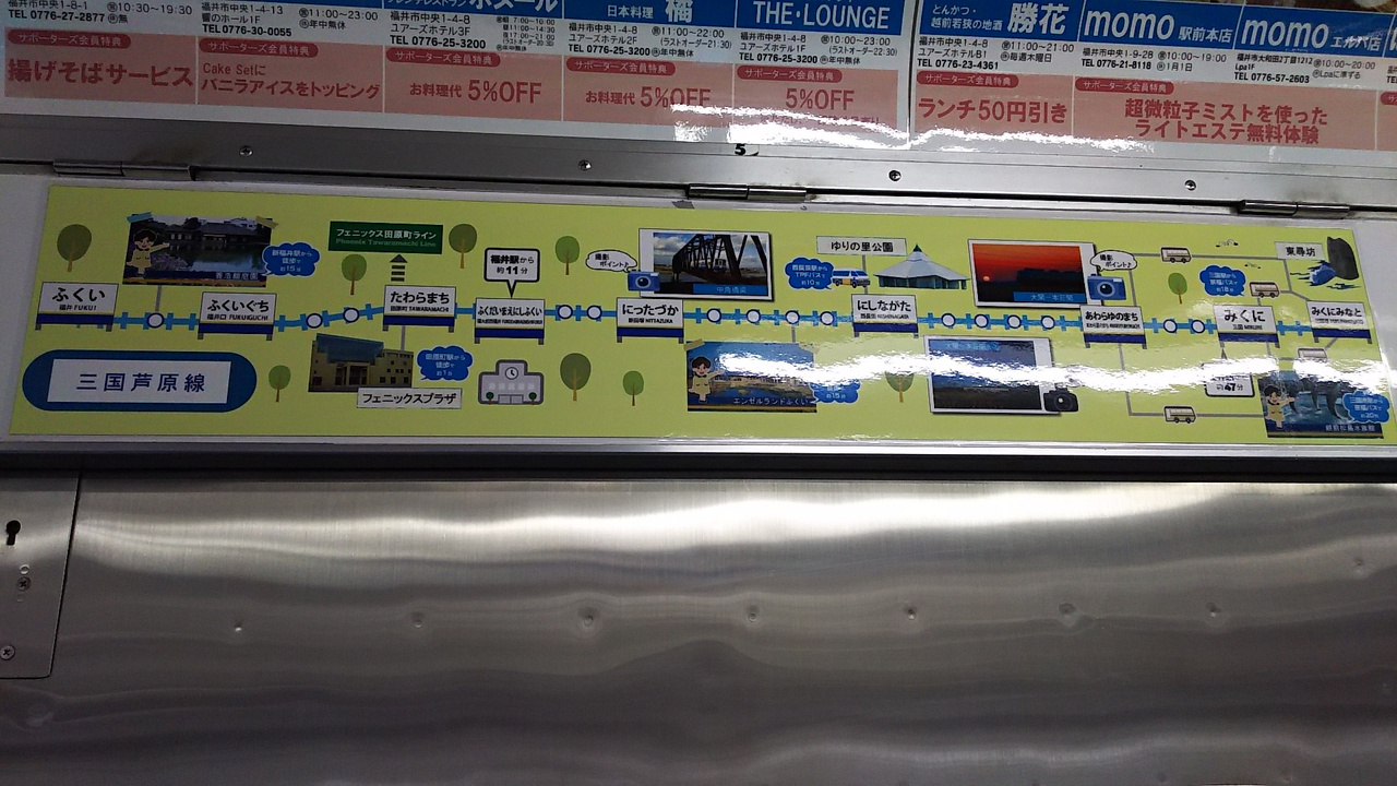 福井駅からあわら温泉・三国へ向かうえちぜん鉄道の路線です。すべて各駅停車で30分おきのダイヤです(利用当時)。