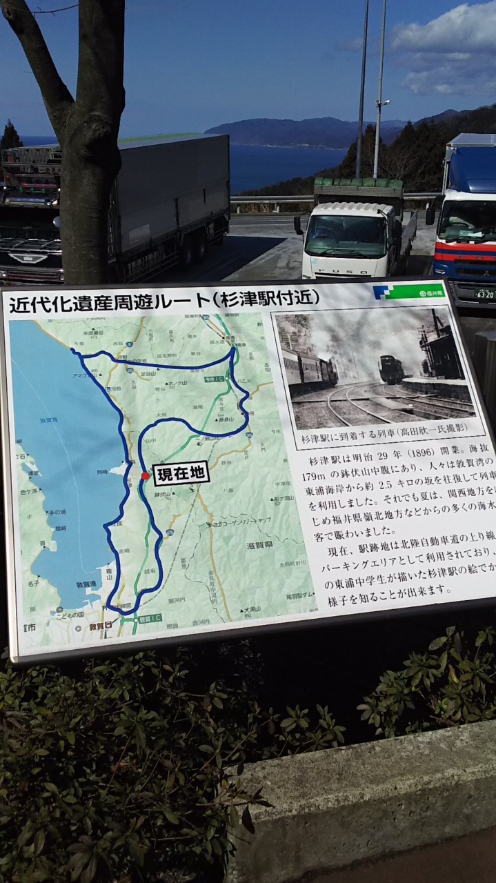 今庄ICと敦賀ICの中間にあるパーキングです。下り線が上にあり、上り下りの車線が逆転している珍しい区間です。上り線は北陸本線の旧杉津駅跡を利用しており、当時の写真がパーキング内で見ることができます。また、下り線は恋人の聖地に認定されているスポットで、ここからの夕日が綺麗に眺められます。晴れた日の日本海の眺めはいいですね。