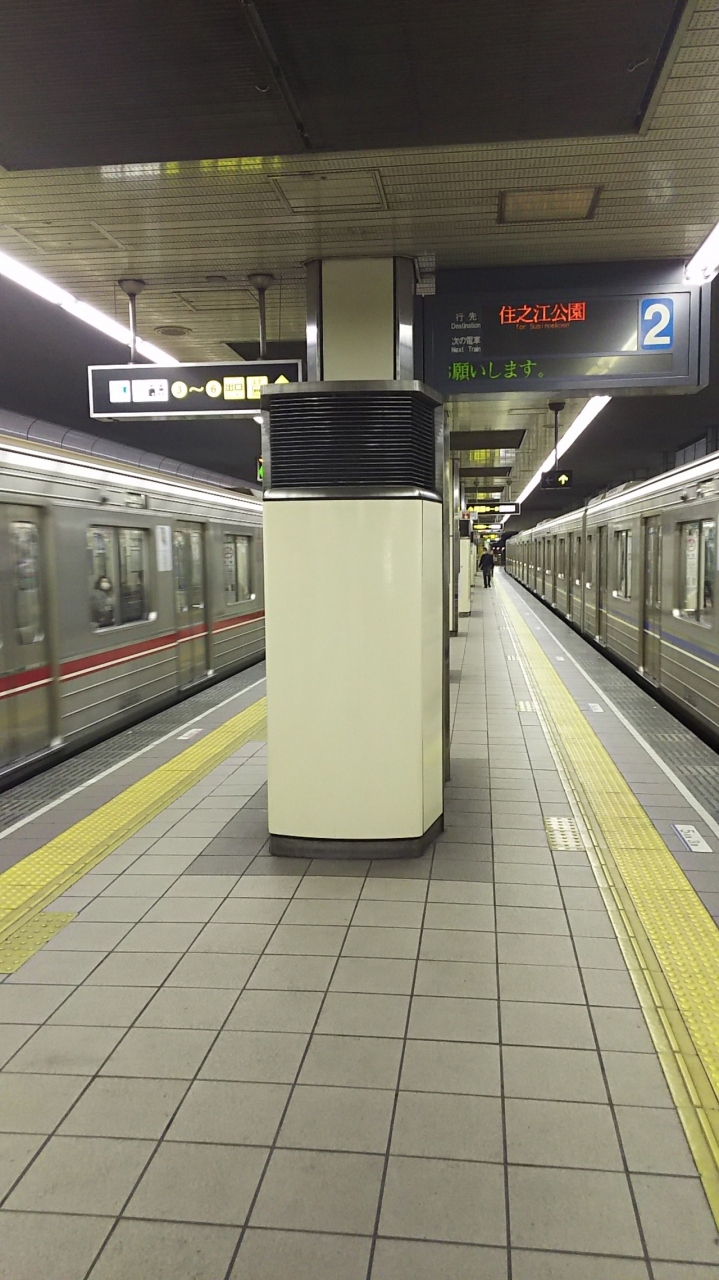 ここは御堂筋線と四つ橋線の乗り換えが同じホームでできるんです。これは楽ですが、ホームが多少狭いためか電車が入ってきたときの風がものすごく強い。なんば駅での乗り換えを考えているのなら、この駅を使うのがベストですね。