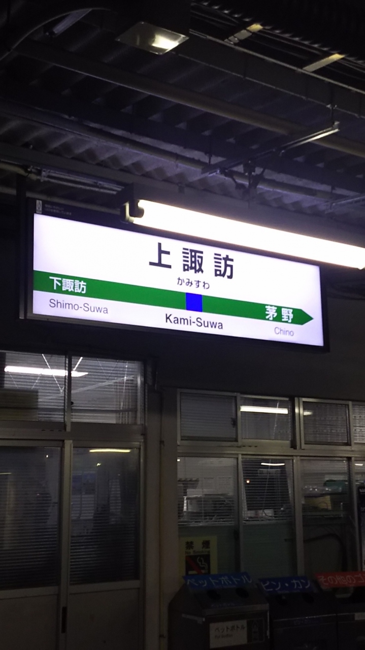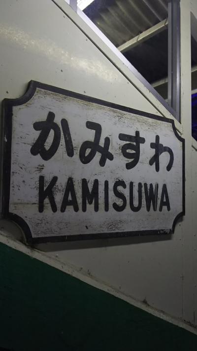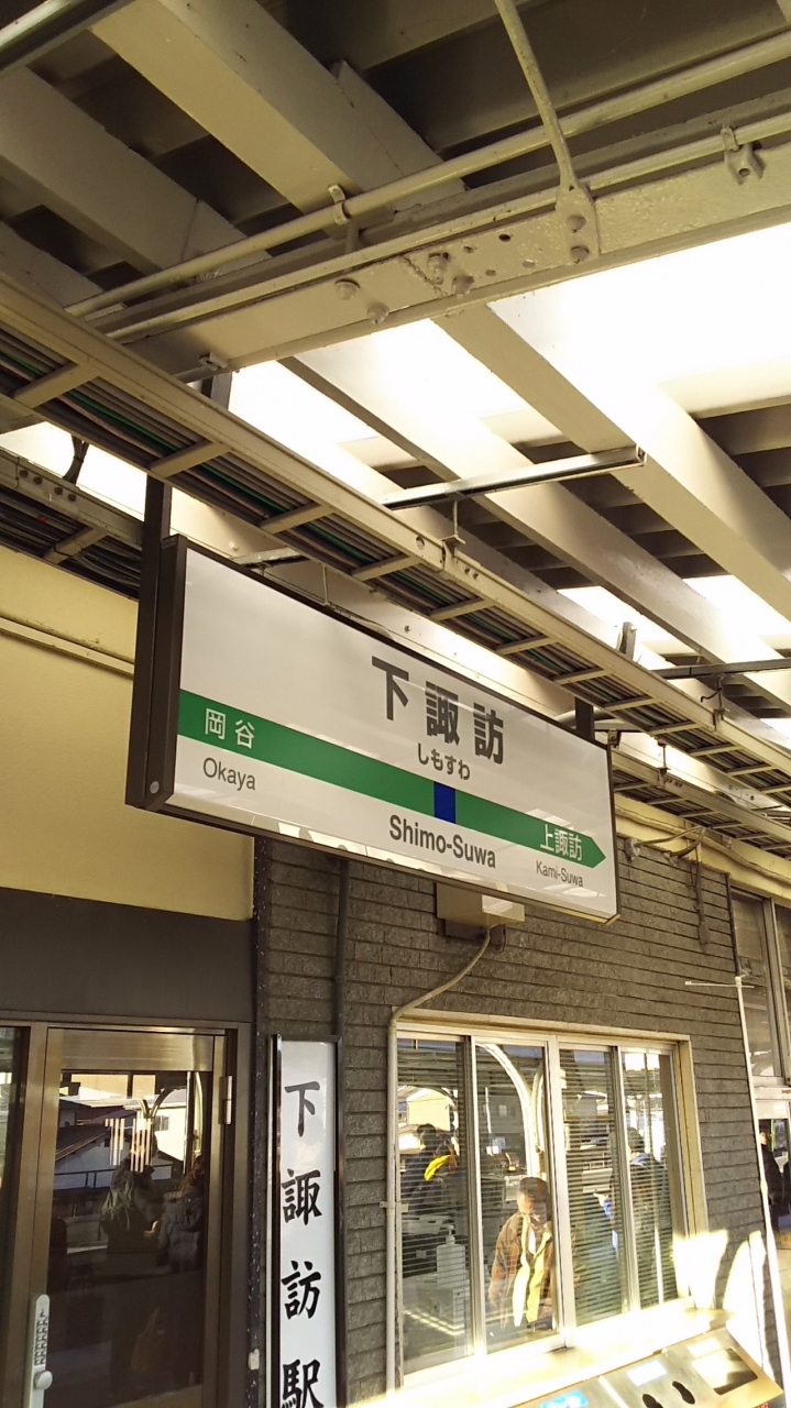 下諏訪駅で初詣のあと、上諏訪駅まで乗り諏訪湖を散策。中央線の車窓からも眺められますが、この駅が一番の最寄りです。夕方になると駅舎全体がイルミネーション。いい雰囲気でした。ホームに足湯がありますが、レトロな駅名標も味があっていいです。