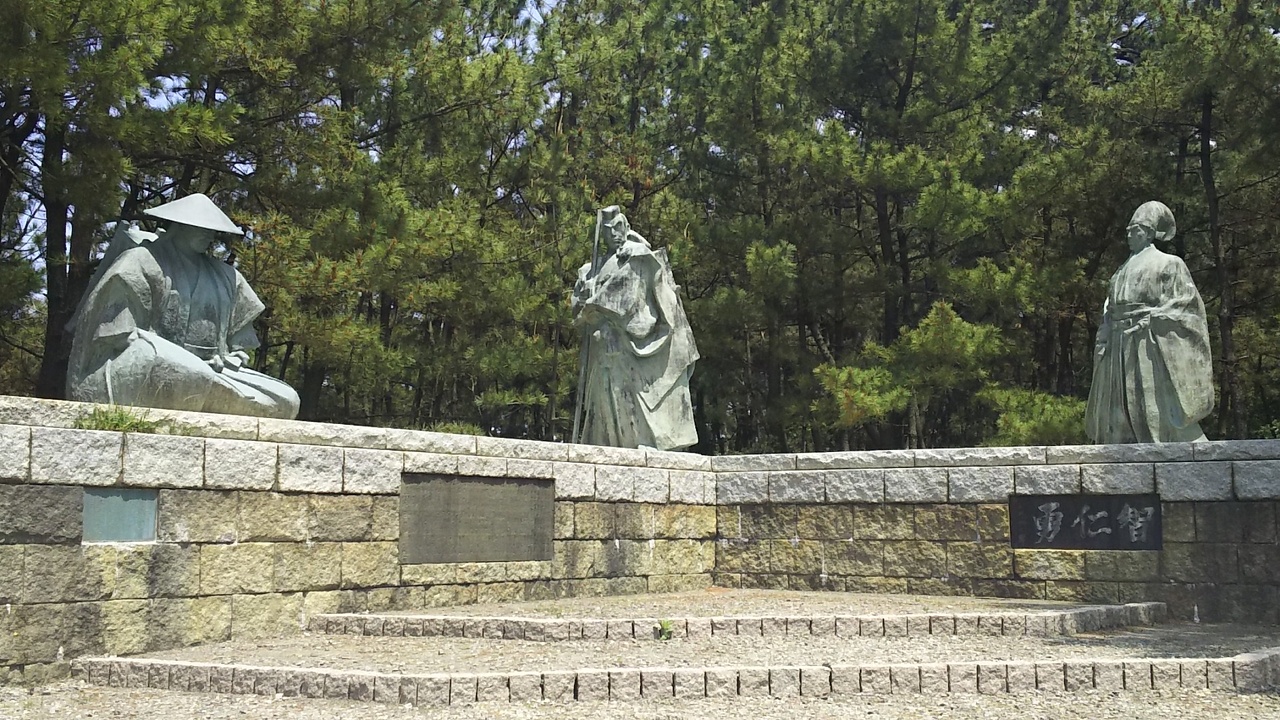 小松空港から車で5分ほど、安宅住吉神社前の駐車場に停めて行くことができます。安宅の関はやはり勧進帳の石碑。源頼朝と弁慶の石像がメインです。日本海を背にして石像を眺めるもよし、公園を歩くもよし。意外と穴場かもしれません。