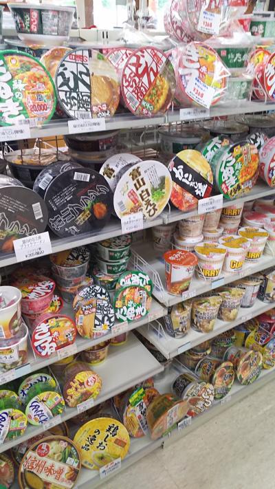 駐車場は広いですが、小さなコンビニがある程度で小ぢんまりとした印象。新潟と富山の土産が揃っています。カップラーメンも東西両方で違うのもここでわかります。それを除けば普通ですね。