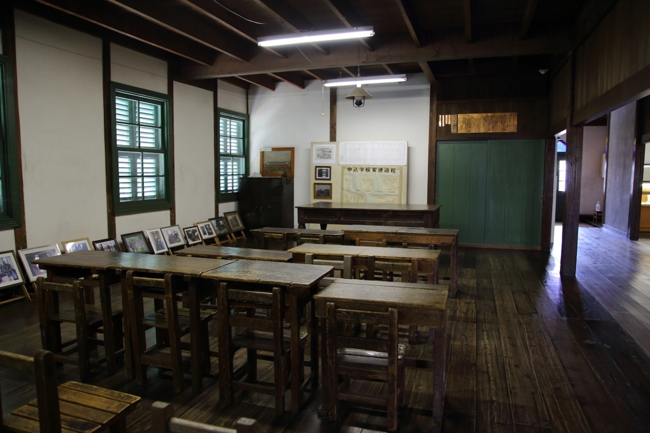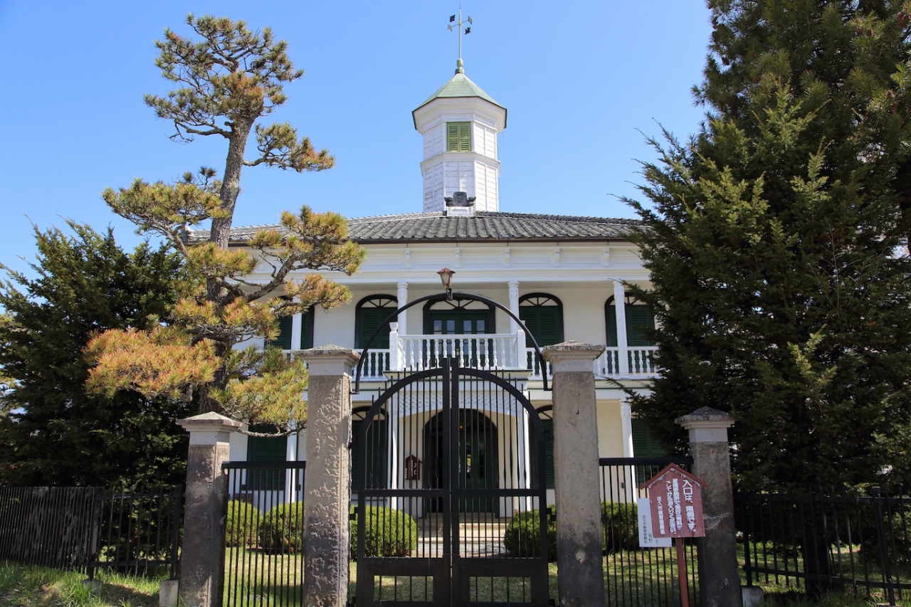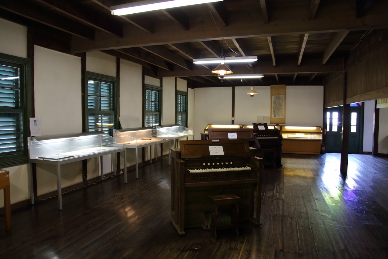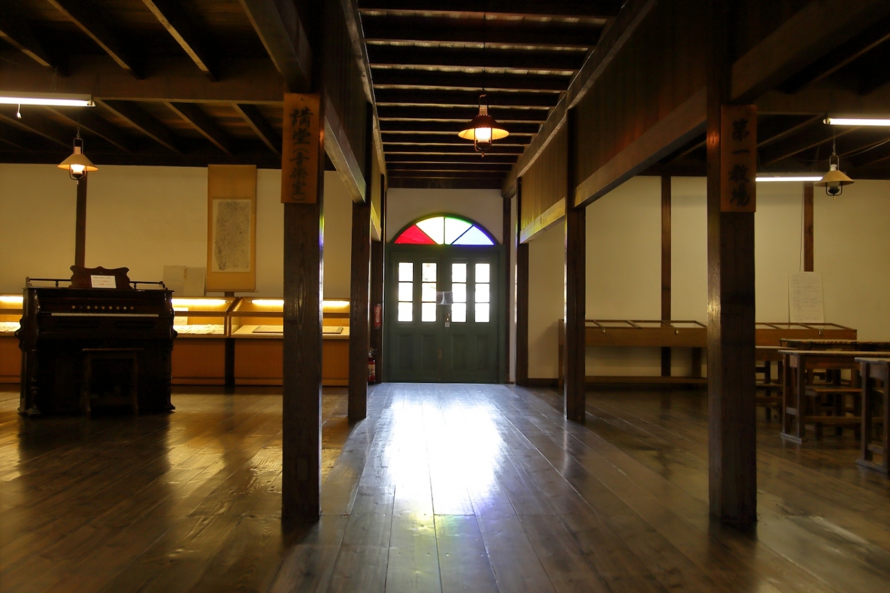 佐久市にある擬洋風建築の学校です。国内に現存している擬洋風の学校では最も古く、松本の開智学校よりも古いです。学校というと普通は横長の校舎を想像しますが、こちらの校舎は縦長になっています。一階の出入り口と2階廊下の突き当りにはステンドグラスがはめ込まれ、当時としては相当モダンな建物だったのだろうと思います。内部はそれほど広くはなく、講堂と4つの教室、校長室と職員室で構成されています。各部屋には当時使われていた教科書や机などが展示されています。