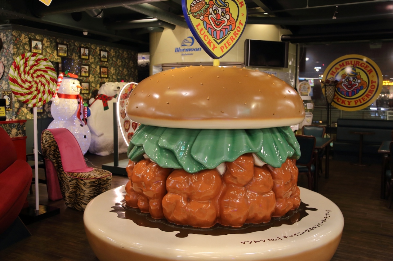 ラッキーピエロと言えば函館のローカルバーガーチェーンとして有名ですが、実際にはバーガー以外にもカレーや焼きそば、オムライスなんかも扱っているファーストフードチェーンです。店舗ごとに内装が違うことでも有名ですね。こちらの店舗はオールドアメリカンをイメージした内装になっているようです。あと、店舗内に遊覧船ブルームーンの切符売り場が入ってますし、ラッキーピエロ印の各種お土産も揃っています。そういう意味では飲食店というより観光地として捉えても良い店舗だと思います。