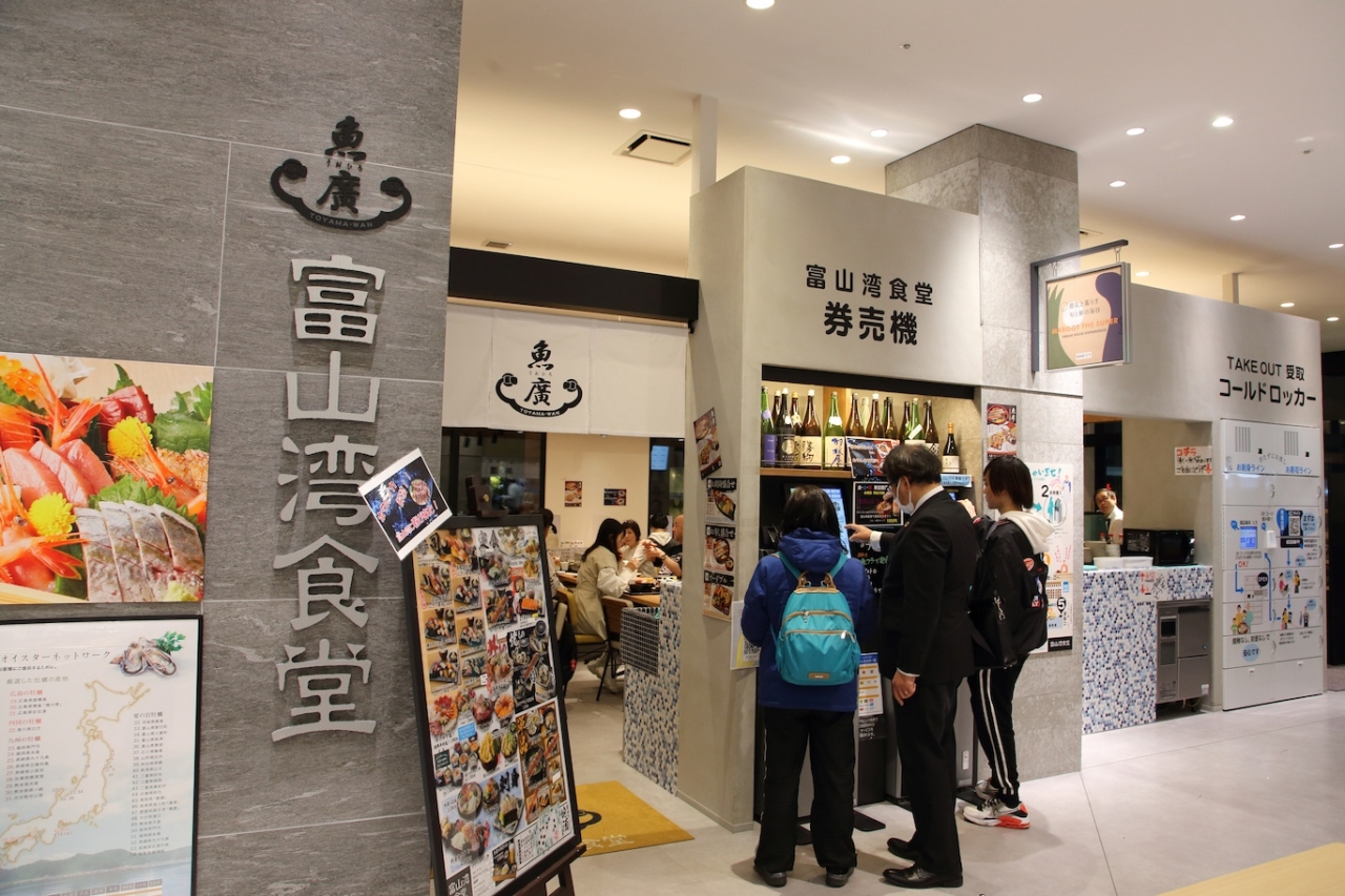 富山駅南口にある商業施設「MAROOT」の1階に入っているお店です。隣接する魚廣という鮮魚店さんが経営されています。基本的にセルフサービスのお店なので、まず席を確保してから店頭の券売機で食券を購入し、カウンターで受け取る形式です。なお、結構込み合っているので、事前に先を確保しておかないと、料理を持ったままでうろつくことになります。ご注意ください。