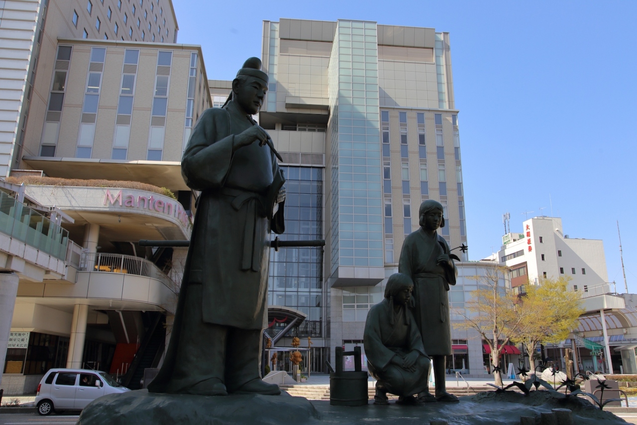 高岡駅北口に建つ大伴家持の銅像です。高岡駅2階のcurun高岡からウィングウィング高岡を結ぶ連絡通路の途中に階段とエレベーターがあるので、そちらから行くと行きやすいです。