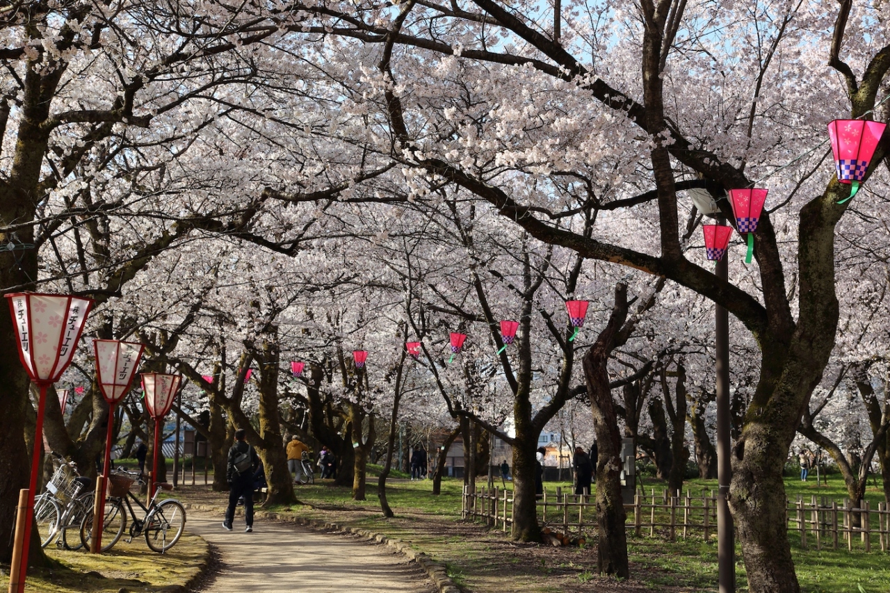 桜を見物に行きましたが、正直そこまででは無いかな、という印象でした。確かに園内には桜が沢山植えられているのですが、本丸広場の周囲や小竹藪広場の周りが一面の桜、という感じなだけで、公園全体が桜色に染まる、というわけではありません。高遠城址公園のように公園全体が桜色に染まっているのを期待して行きましたが、肩透かしでした。純粋に高岡市内で桜を見たいなら、少し離れていますが岸渡川に行くと良いでしょう。福岡駅(あいの風とやま鉄道の駅)からすぐ近いですし、川の両岸に植えられた一面の桜を堪能できます。