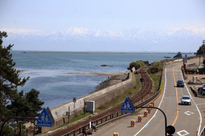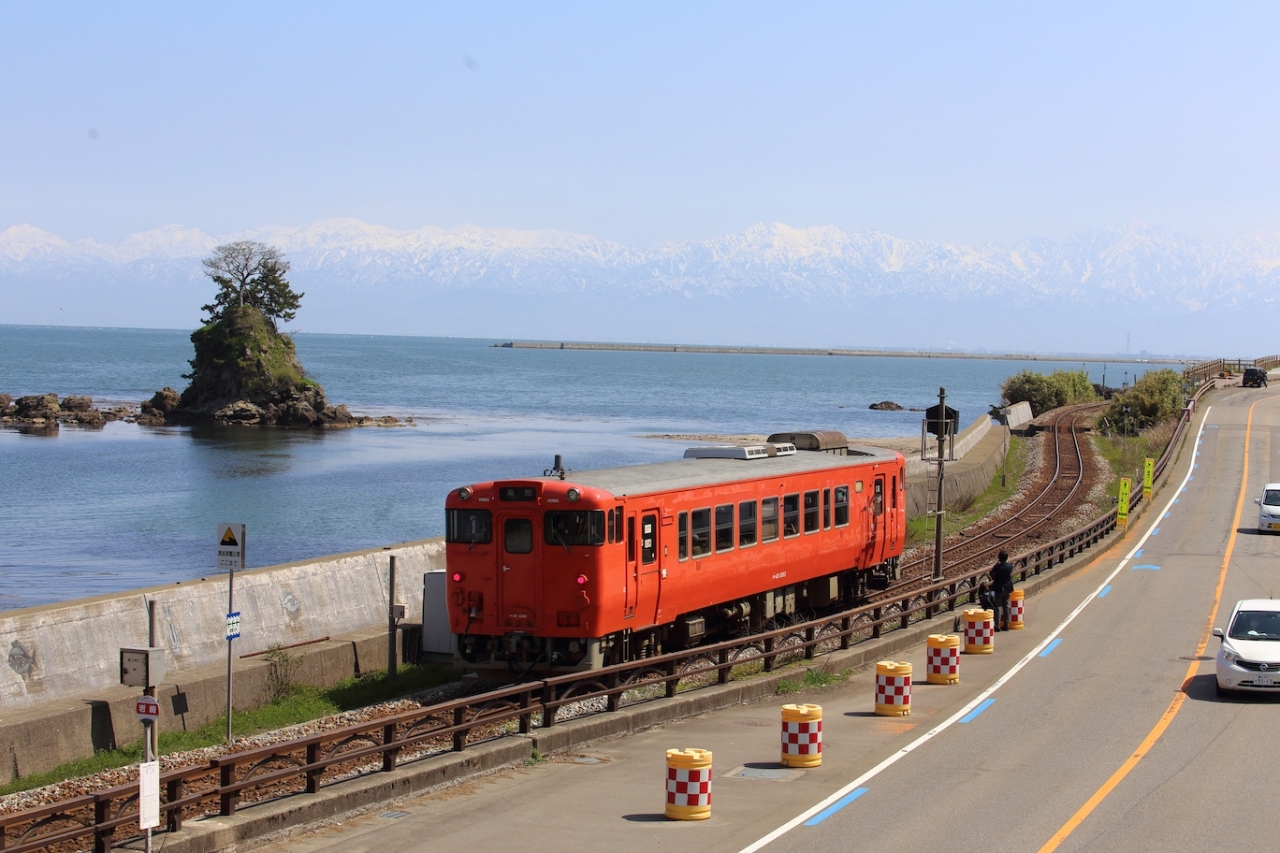 アクセスは良好で、JR氷見線の雨晴駅で降りれば真後ろが雨晴海岸です。駅西側の路地から砂浜に出られますし、駅の目の前の道を高岡方面に戻り、義経岩の前の踏切からも砂浜に出られます。丁度駅の裏手にビューポイントが整備されているので、個人的には駅西側の路地から砂浜に降り、義経岩方面に向かっていくのがお勧めです。