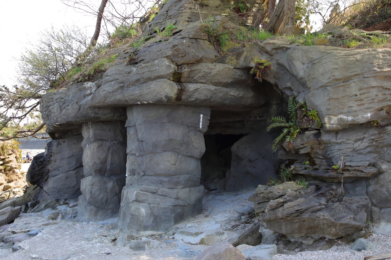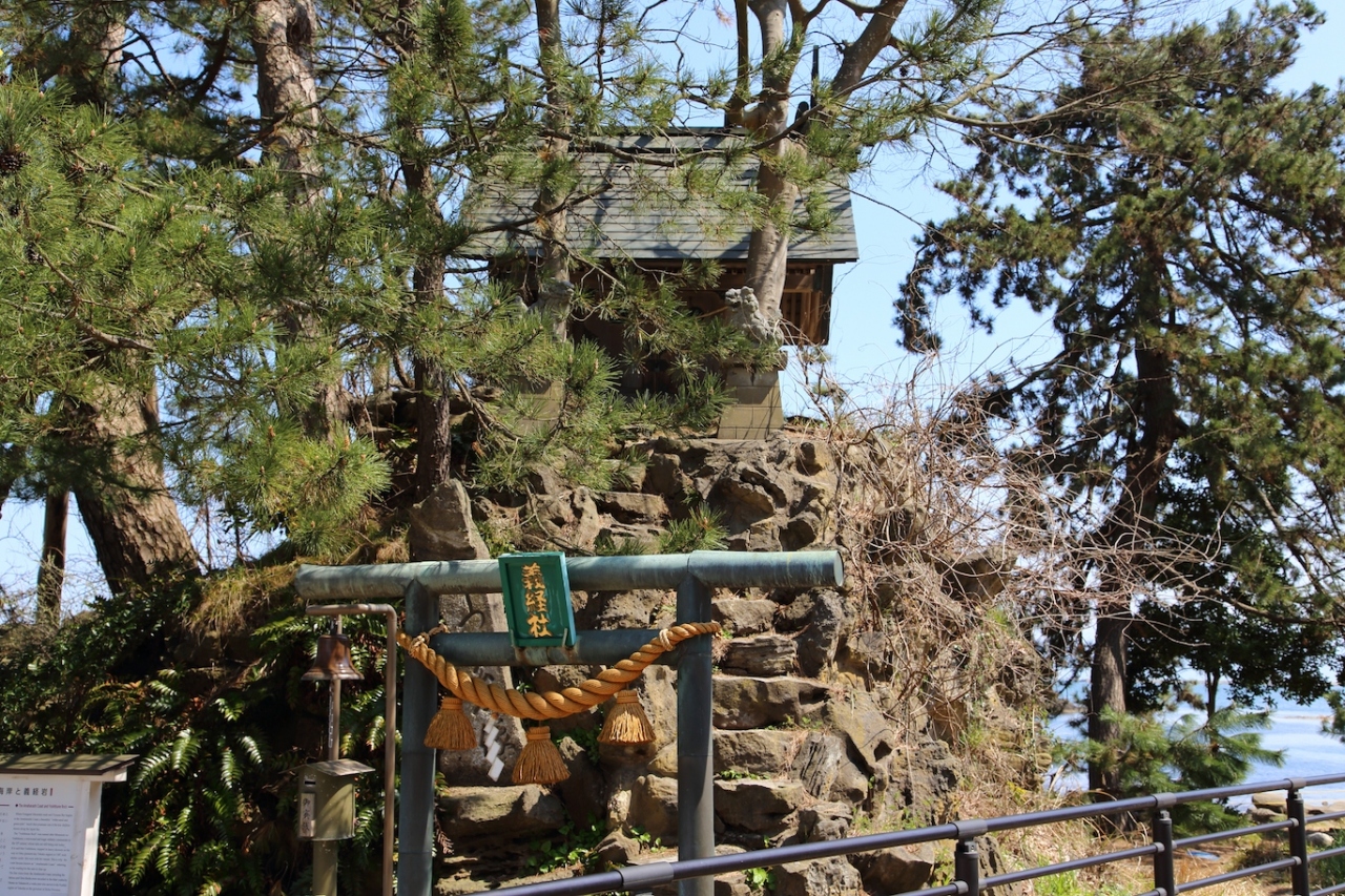 雨晴海岸にある、源義経一行が雨宿りをしたと伝えられる場所です。岩の上には義経神社が祀られています。道の駅 雨晴の目の前にある踏切を渡ると真正面にあるので、直ぐに分かると思います。