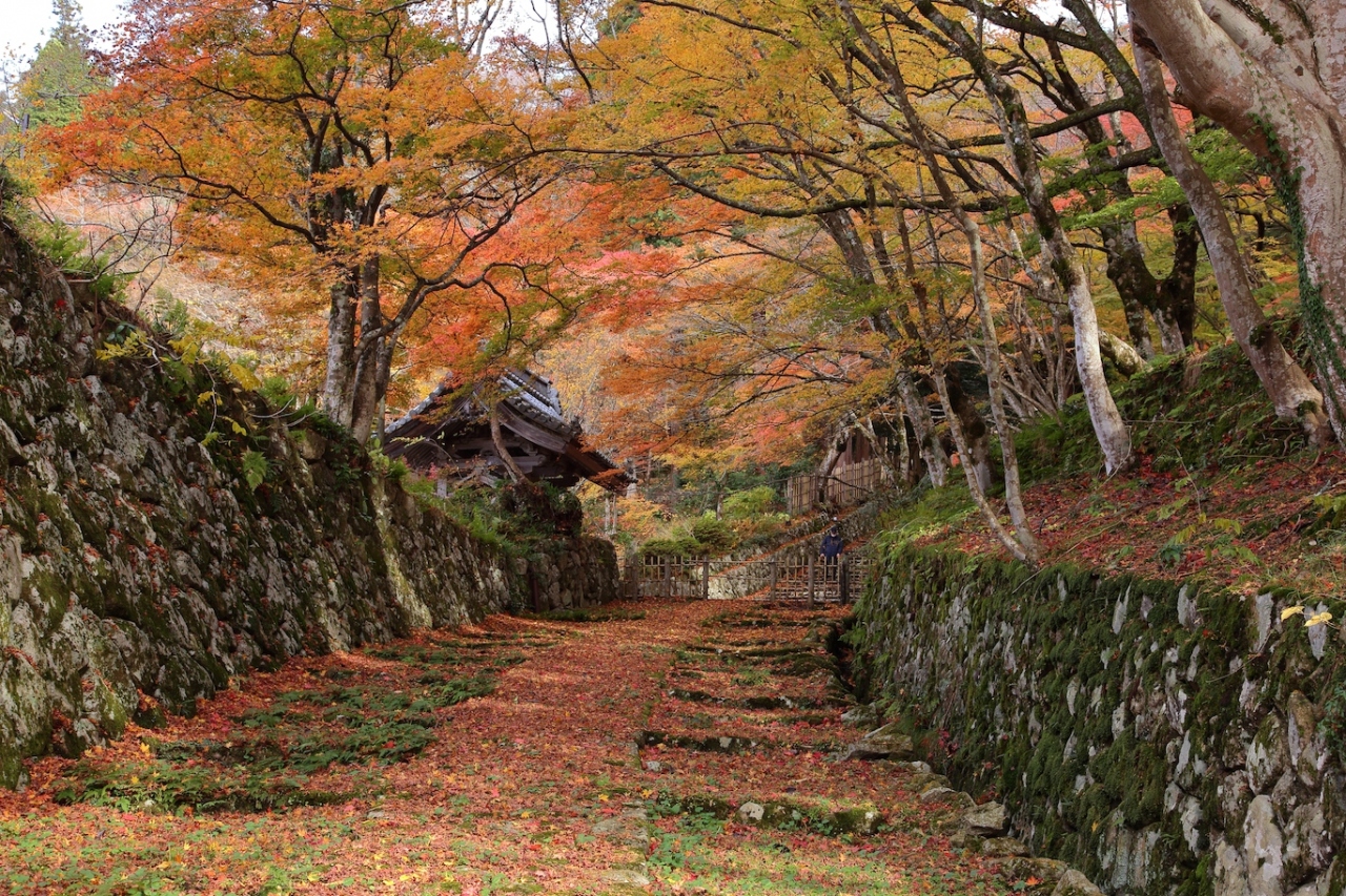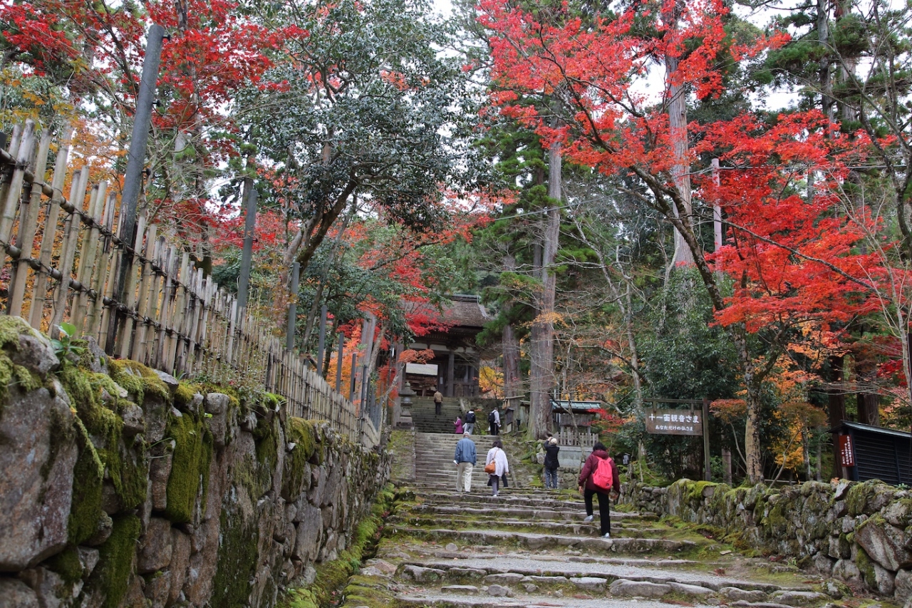 湖東三山の1つで、日本紅葉100選にも選ばれている寺院です。湖東三山はそれぞれ紅葉で有名ですが、こちらは表参道から表門に続く石段と石垣、紅葉の組み合わせで有名ですね。写真をご覧になったことのある方も多いと思います。過去にも訪問していますが、紅葉の終わりかけの時期だったために満足に楽しめなかったので、紅葉の最盛期を狙って訪問しました。