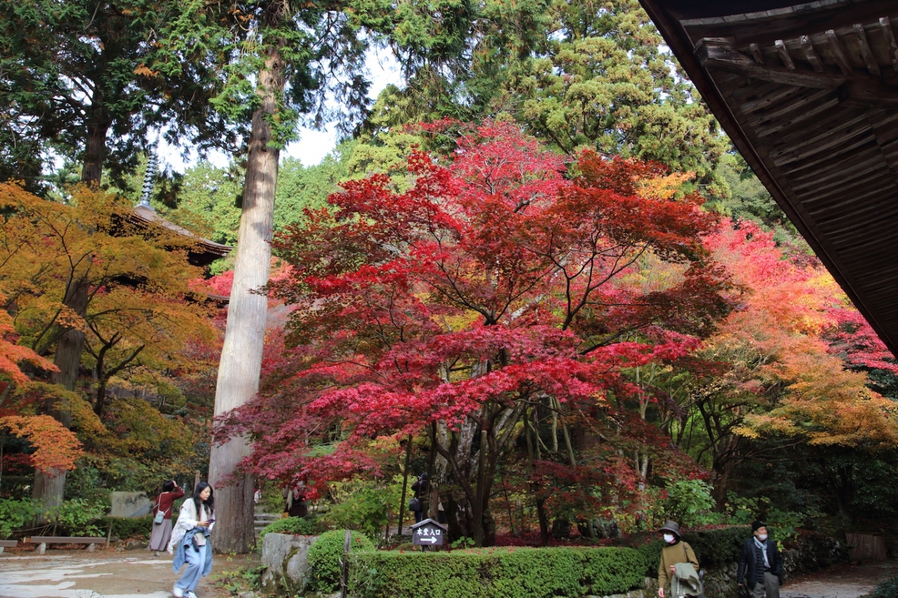 湖東三山は何処も紅葉で有名ですが、こちらの紅葉が一番美しいと思います。黒門から西谷堂までの参道は紅葉に覆われて紅葉のトンネルを形作っており、見ごたえがあります。名勝庭園は真っ赤な血染めの紅葉が池に映え、何とも言えない景色を見せてくれます。多少大変ですが、お地蔵様の並ぶ参道を上って本堂まで行けば、国宝の本堂と紅葉に包まれた三重塔が出迎えてくれます。黒門から本堂までは結構高低差があるので境内全体を回るには時間が掛かりますが、境内全域が紅葉に包まれているので、是非時間を取ってご覧になることをお勧めします。ただ、庭園から本堂までは結構高低差があるため、紅葉の時期は多少ズレがあるようです。紅葉狩りの際はご注意ください。