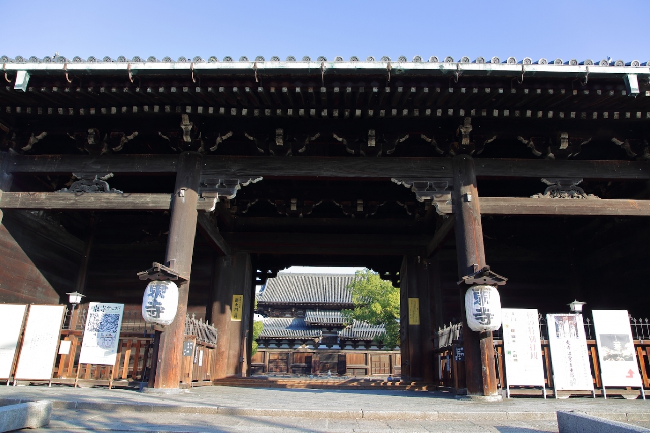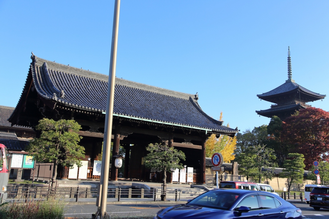 京都駅の南口である八条西口から然程離れていないので、散歩がてら歩いて行くのも良いと思いますし、近鉄の東寺駅を使うのも良いと思います。ただ、バスで行かれる場合、東寺付近のバス停に停まるバスは全て北口のバスターミナルから出ていますので、ご注意ください。なお、南大門が非常に立派ですし、南大門西側の歩道橋からの南大門と五重塔は一見の価値がありますが、残念ながら南大門からは境内に入れません。南大門の真後ろに建つ金堂とは柵で区切られていて、普段は施錠されているためにそれ以上進むことができません。拝観は東側の慶賀門からになるので、こちらも注意が必要です。慶賀門最寄りのバス停は東寺東門前です。