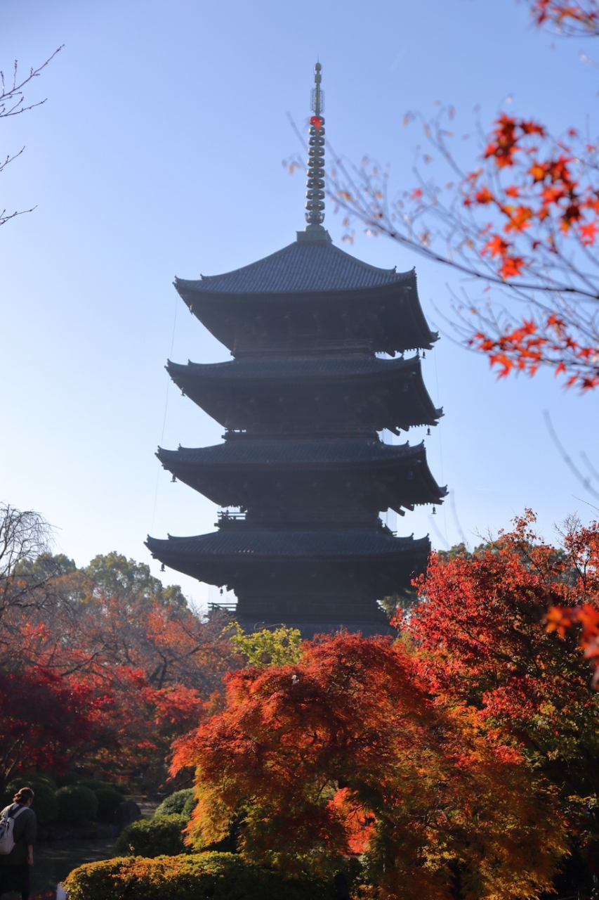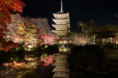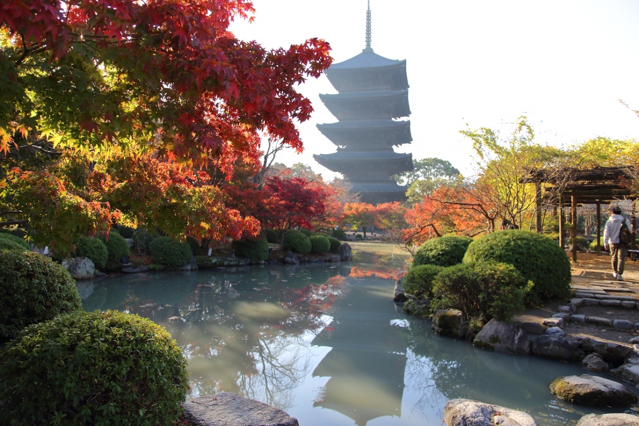 建築物や仏像を見るためだけに訪れる価値のある東寺ですが、紅葉も見事です。瓢箪池と宝蔵の周囲に植えられているだけなのですが、配置が非常に効果的で、水面に映る紅葉を楽しめます。特に、瓢箪池の北側から見る紅葉と五重塔が水面に映る景色は見事の一言です。日中の景色と夜景のどちらもが素晴らしいので、時間が許せば両方をご覧なることをお勧めします。因みに、こちらは京都の寺院としては珍しく、夜間の特別拝観で三脚を使うことができます。おかげで夜間の写真撮影がしやすく、大変助かりました。ただ、やはり三脚は場所を取りますから、周りに迷惑を掛けると禁止されてしまうと思います。節度を持って使用するようにしましょう。- 旅行時期