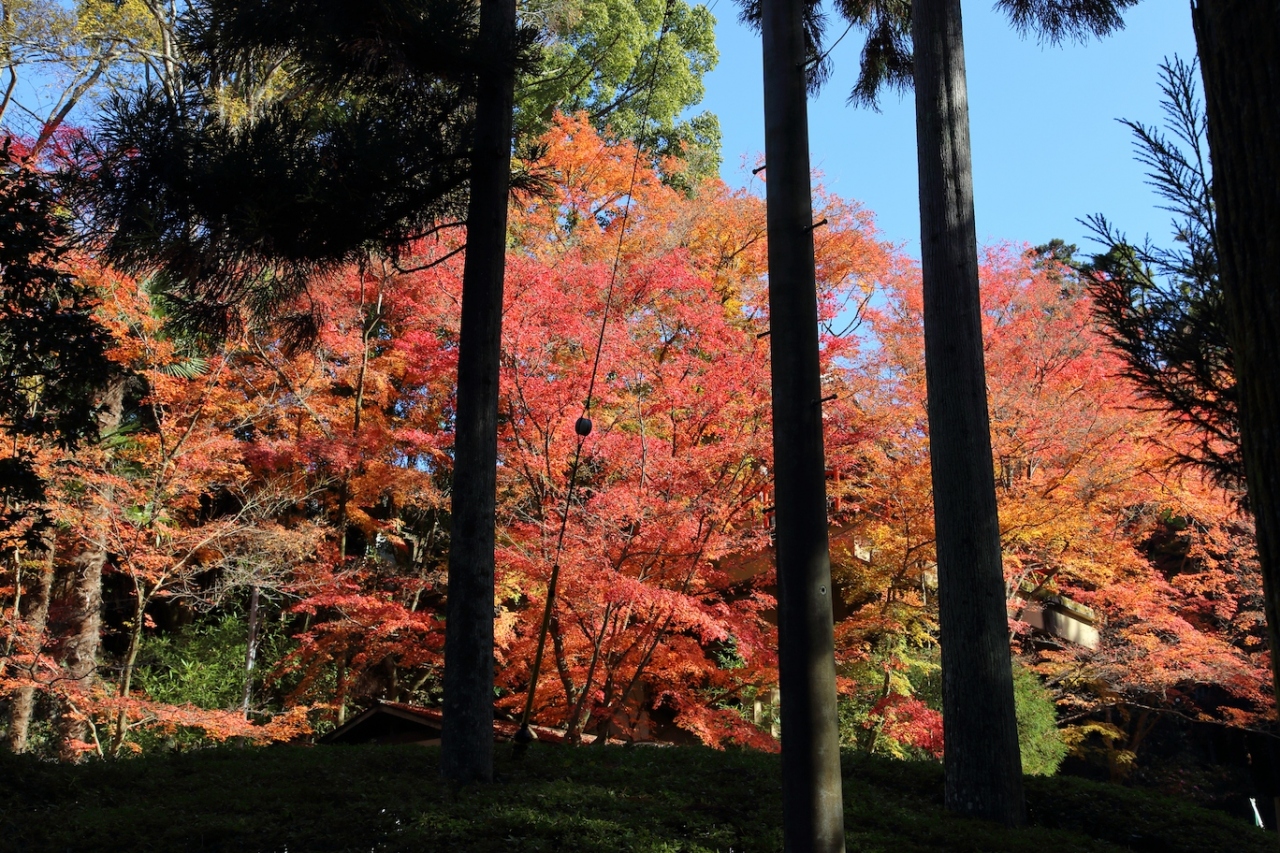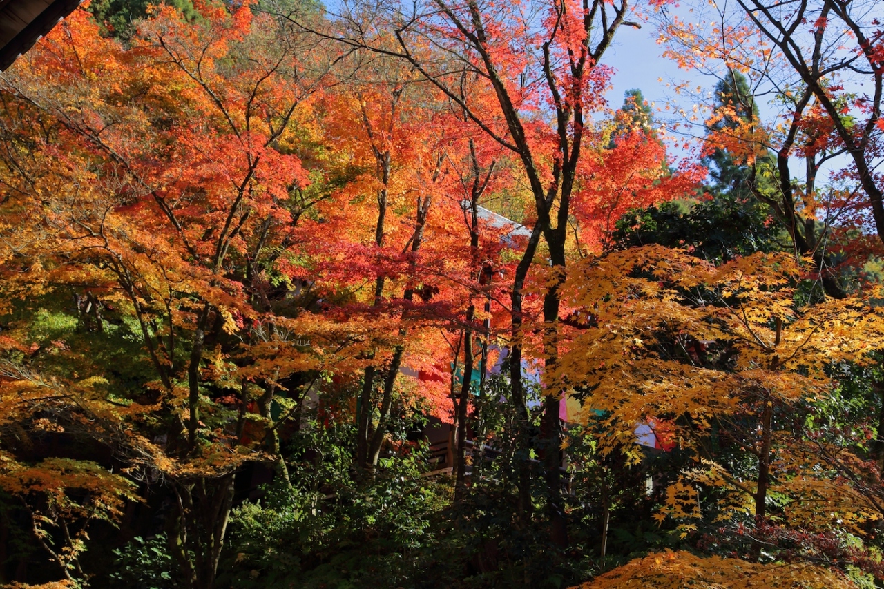 こちらの特徴は紅葉と桜が一度に見られる点だと思います。境内に植えられている不断桜は秋に開花するので、紅葉の赤や黄色と薄いピンク色の花を同時に見ることができます。不断桜は染井吉野の様な豪華さはありませんが、可憐な不断桜と赤と黄色、緑のコントラストは一見の価値があります。蓬莱庭も一面が苔に覆われていて、紅葉と苔の織り成す景色は素晴らしかったです。本堂や三重塔の周りには紅葉はあまりありませんが、建物自体は重厚で歴史の長さを伝えてくれるものでした。- 旅行時期