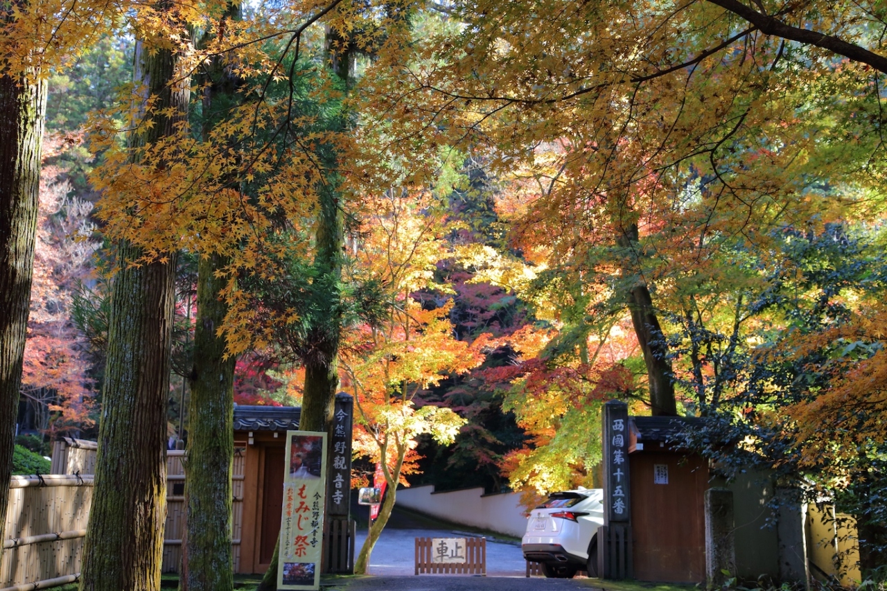 湖東三山の1つで、仁明天皇の勅願で開かれた古刹です。他の湖東三山の寺院と同じく本堂や三重塔は国宝に指定されています。こちらは境内を名神高速が横切る形になっていて、総門前の駐車場は国道307号に面しており、庭園の蓬莱庭近くの駐車場は名神高速を渡ったところにあります。こちらの紅葉は蓬莱庭周辺に纏まっているので、時間が無い方は蓬莱庭近くの駐車場を利用されることをお勧めします。