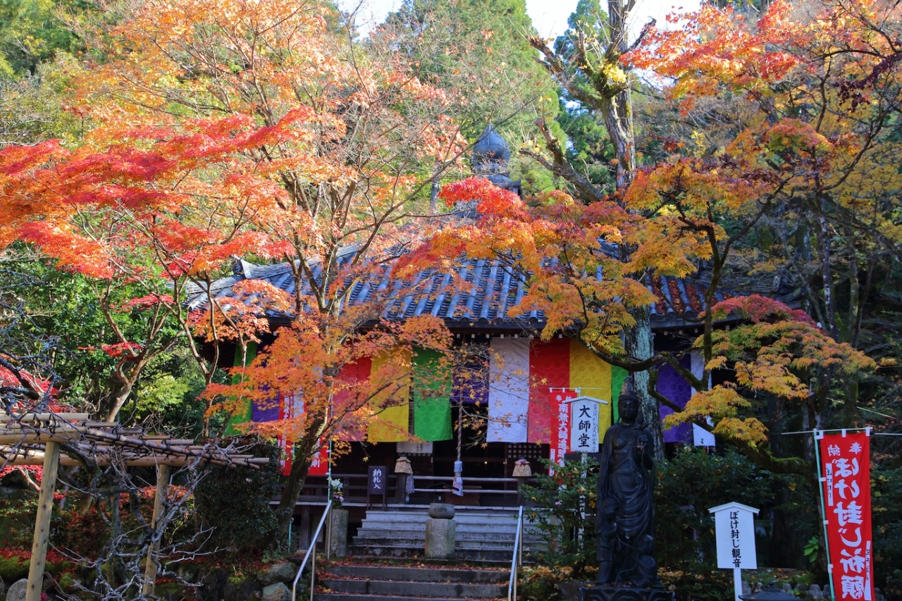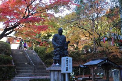 こちらは紅葉の名所として知られていますが、噂に違わず見事な紅葉を見ることができました。鳥居橋から続く参道から境内の美しい紅葉が見え、境内に入ると茶所を覆う見事な紅葉が出迎えてくれました。そのまま境内を本堂に向かって進んでいくと、子まもり大師像や本堂、大師堂、医聖堂などが紅葉に囲まれた見事な景色を見ることができました。また、茶所のガラスに紅葉が映り込み、非常に見ごたえのある景観を作っていました。