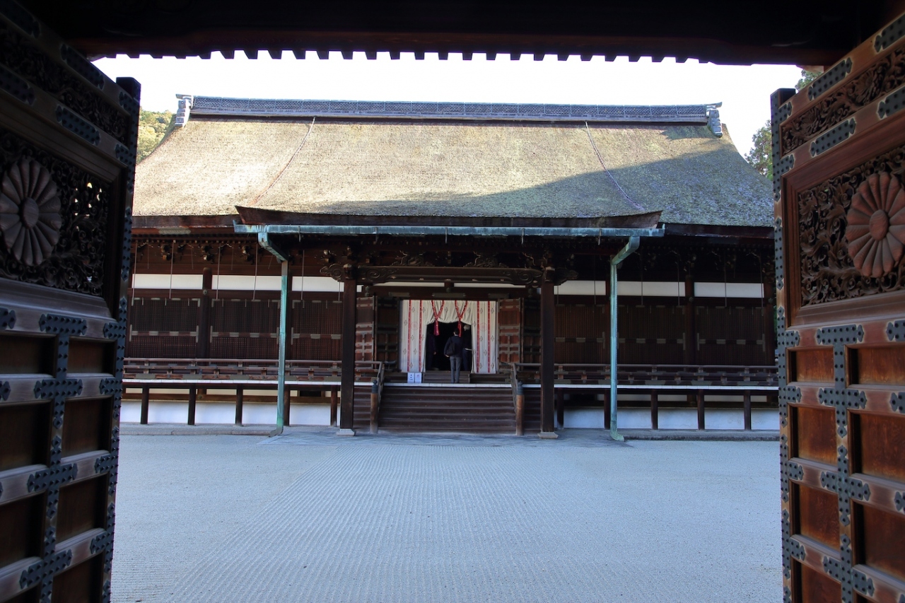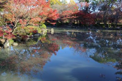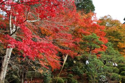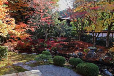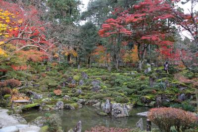 大門を潜ると緑に覆われた下り参道があり、その先に仏殿と舎利殿が並んでいる景色が見えます。良くポスターなどでみる構図なので、結構感動しました。ただ、常時拝観できる建物は多くなく、通常はこの2つの他は楊貴妃観音堂くらいです。私が訪問した際には特別拝観として本坊と御座所、霊明殿が公開されていました。御座所はもともと御所の御殿を移築したものなので、流石に立派なものでした。御座所の庭園は小ぢんまりとしたものですが、小川と石塔が設えられた上で紅葉が植えられており、美しい散紅葉を楽しませてくれました。なお、この御座所は平成になってからも実際に天皇・皇后両陛下が使われたそうで、現役のようです。