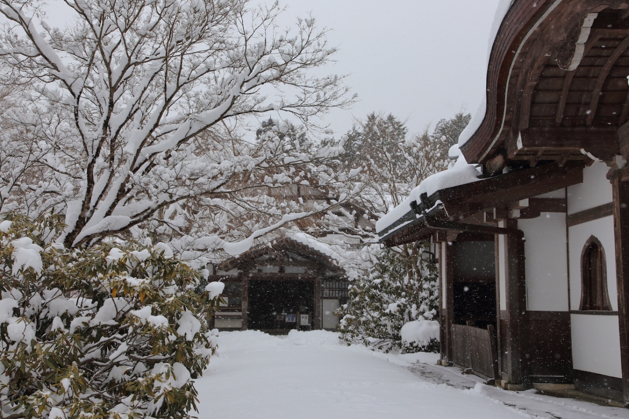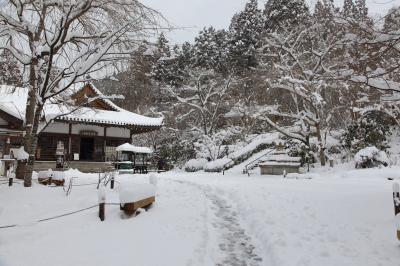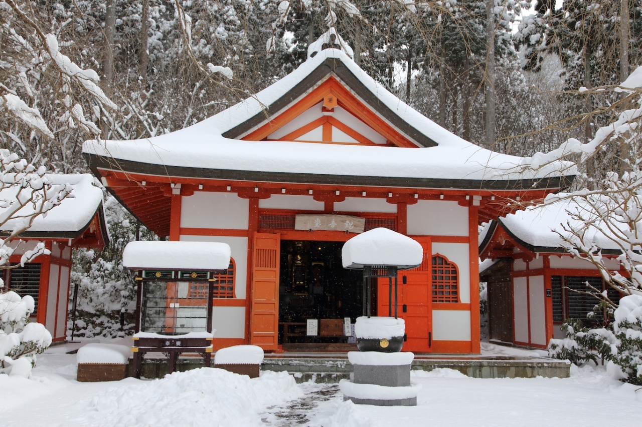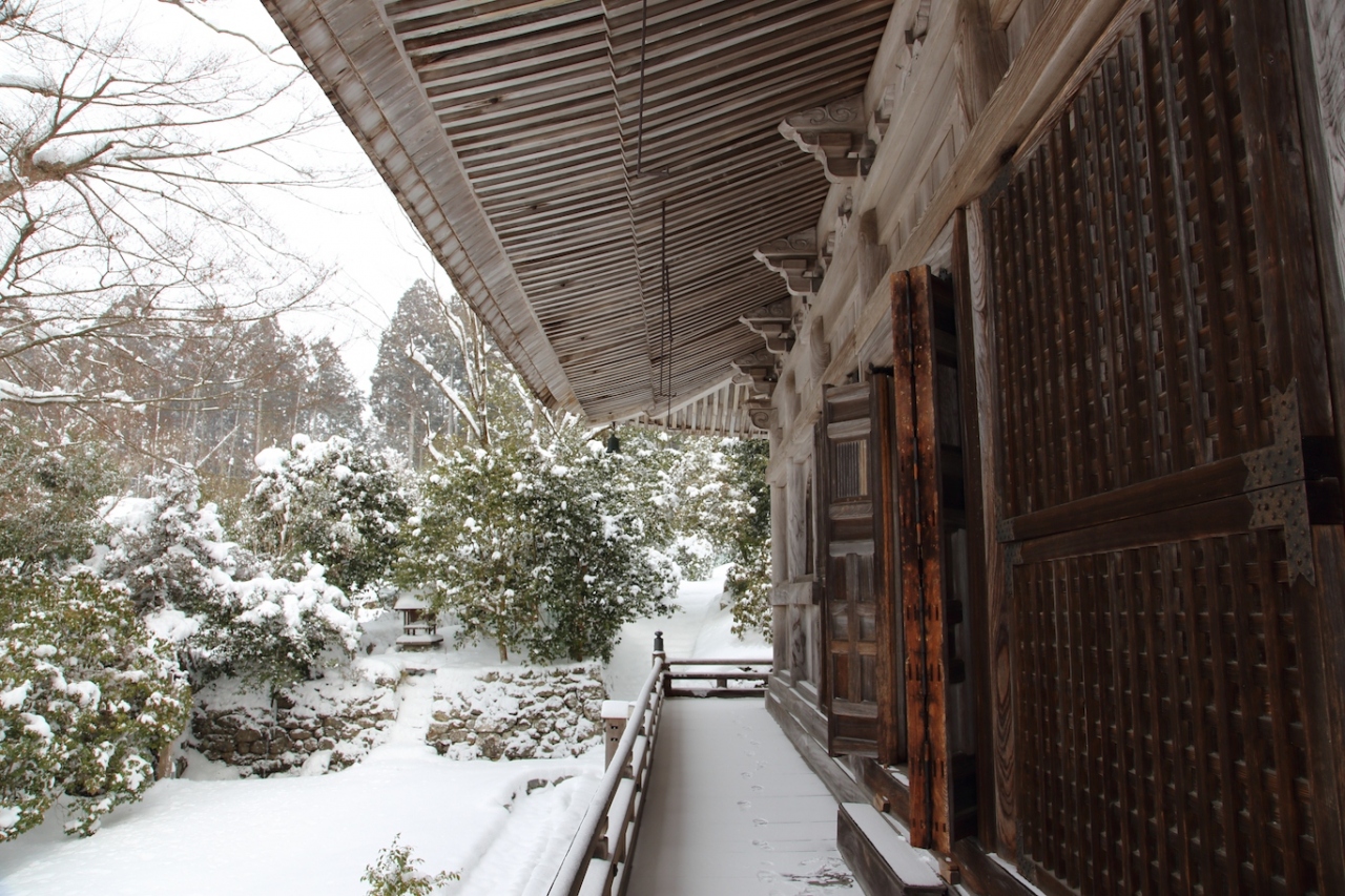 大雪の際に訪問したので小ぢんまりとした境内一面に厚く雪が降り積もっており、本堂や鐘楼なども厚く雪を纏い、荘厳な佇まいでした。いかにも雪深い山寺という雰囲気を醸し出しており、なかなか趣深い景色でした。中心にある本堂は江戸中期に建てられた立派なものです。内部には「証拠の阿弥陀」と呼ばれる阿弥陀如来さまが祀られており、間近で拝むことができました。なお、本堂では声明が聴けるようになっています。声明は日本の伝統音楽の基礎になったものですから、聴いてみるのも良い経験と思います。- 旅行時期